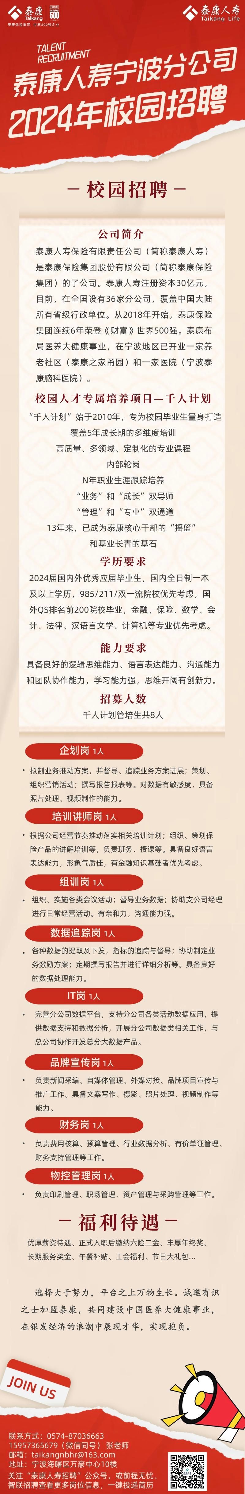 泰康人寿宁波分公司2024校园招聘简章