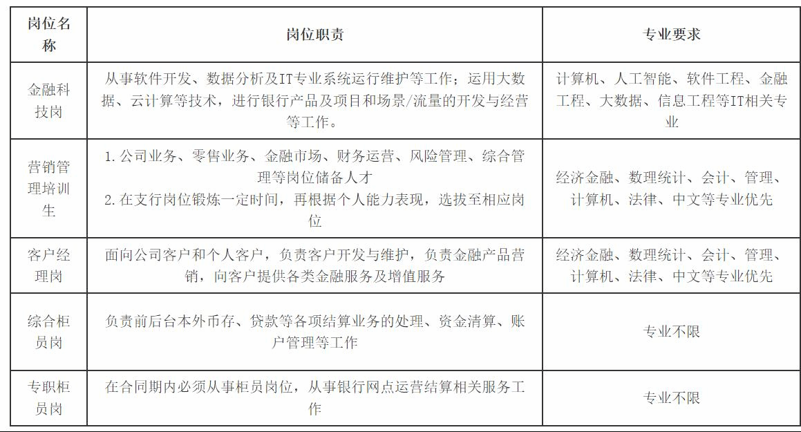 春季校园招聘岗位分为管理培训生、金融科技类、市场营销类、柜面操作类共4大类岗位。
