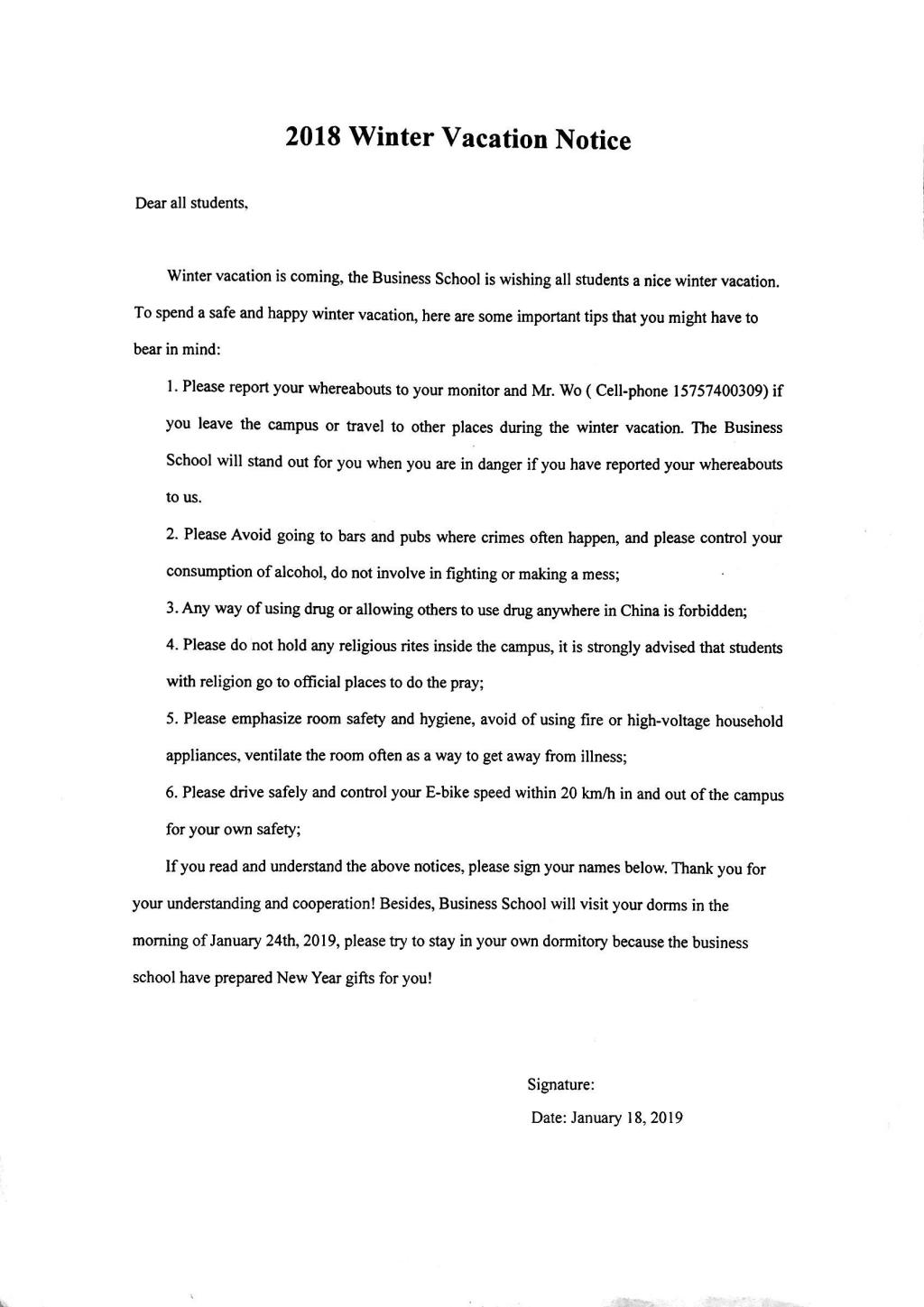韩雯琛首先就这次安全稳定会议的主要目的及意义发表了讲话。随后,辅导员毛跃祖就留学生在寒假出行、假期日常生活、宿舍安全用电等注意事项进行了解释和说明。最后,我院留学生办公室辅导员向留学生下发寒假留宿安全告知书,留学生在仔细阅读并明确告知书相关内容后,在告知书上签名。