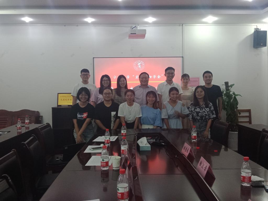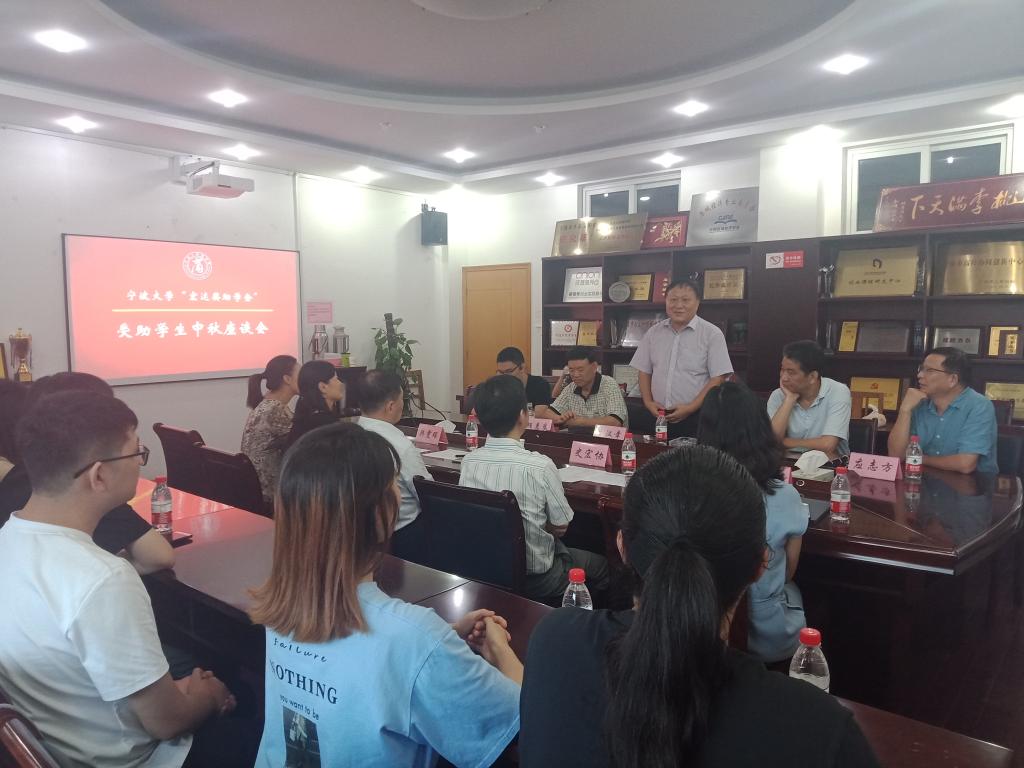 2019年9月10日下午,宁波大学“宏达奖助学金”受助学生中秋座谈会在电竞博彩 418会议室隆重举行。宁波宏达货柜储运有限公司董事长陆汉幸、原宁波市北仑区区长王志明、原宁波市北仑区人大顾惠良副主任;电竞博彩-国内电竞博彩 院长金祥荣、电竞博彩-国内电竞博彩 党委书记史宏协、电竞博彩-国内电竞博彩 党委书记副书记韩雯琛、宁波大学法学院党委副书记孙芬娜、电竞博彩-国内电竞博彩 工商管理系教师应志芳以及近20余名“宏达奖助学金”受助学生出席座谈会。