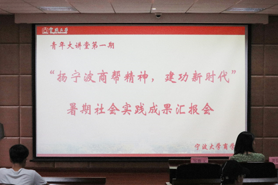 本次报告会分为九个院级优秀团队实践成果汇报和院团委老师点评致辞两项议程。首先,九个团队通过诗歌朗诵、现场模拟宣讲、剪辑制作小视频等方式,在报告会上追溯老革命的红色印迹、讲述宁波商帮精神、提出调研建设性建议。汇报过程中,“红色文化”“企业创新”“经济发展”等关键词层出不穷,与本次 “扬宁波帮精神,建功新时期”的主题相呼应。最后,龚昆朋老师肯定了各团队在本次暑期社会实践中取得的成果,指出了本次活动对能力提升与思维创新的积极意义。