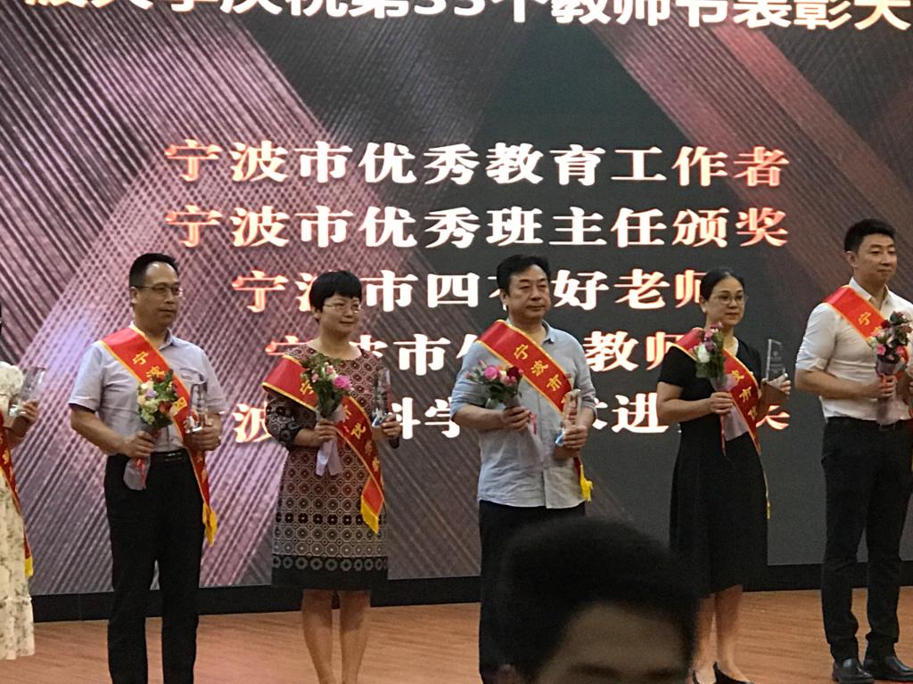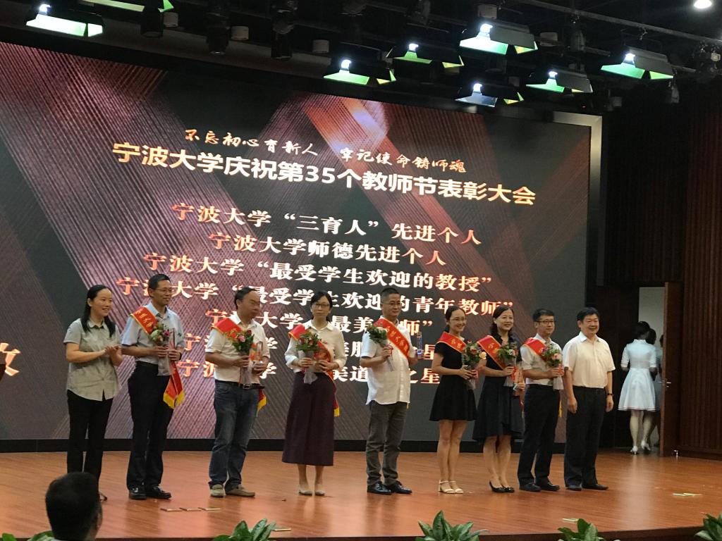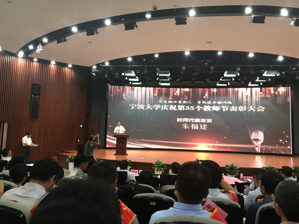 在表彰会上,我院共有五名教师获得表彰,分别是邱妘获得浙江省高校优秀教师,周新苗获得宁波大学最受欢迎教授,金安获得宁波市优秀思政课程教师,黄惠琴获得宁波市优秀教师,朱福建获得宁波大学师德先进个人。表彰会上朱福建老师还代表全体教师做主题为《桃李不言 下自成蹊》的发言。