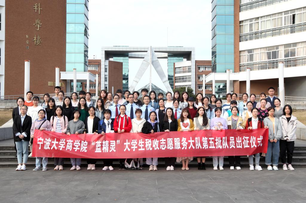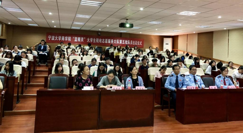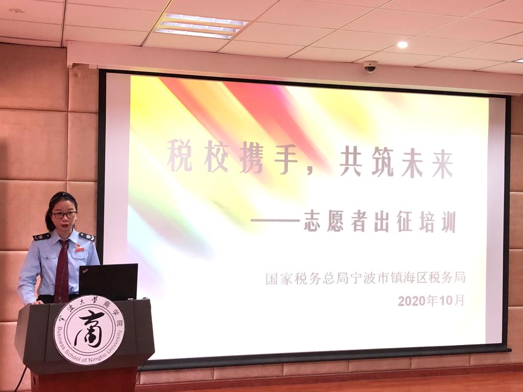 2020年10月28日,我院“蓝精灵”大学生税收志愿服务大队第五批队员出征仪式在学院109报告厅举行。宁波市镇海区税务局副局长屠晓军、镇海区税务局纳税服务科科长方锐、镇海区税务局蛟川税务所和骆驼税务所负责老师、我院党委副书记韩雯琛和学院学生党建工作相关辅导员出席本次出征仪式,“蓝精灵”大学生税收志愿服务大队100余名同学参与此次活动。