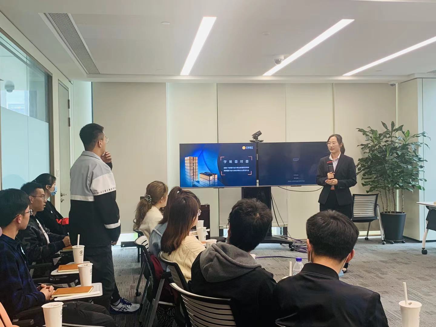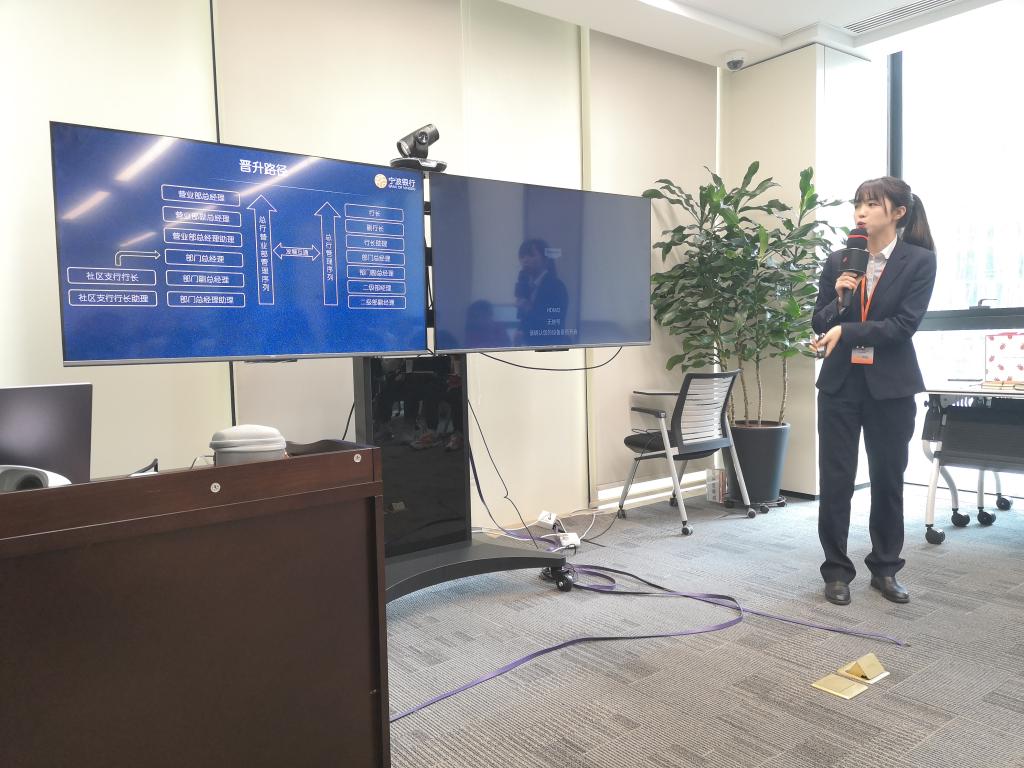 首先,黄荣荣向在场的老师、同学介绍了宁波银行总行营业部的概况,就银行发展历程、薪资福利、专业提升、能力培养、晋升空间等方面做了详细的介绍,使在场师生对宁波银行总行营业部有了初步了解。