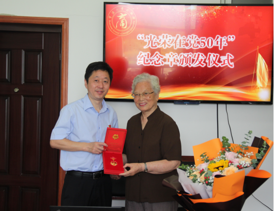 为深化贯彻落实中组部和省委、市委组织部通知精神,高质量做好“光荣在党50年”纪念章颁发工作,切实传递党的关爱,充分发挥纪念章激励作用。我院高度重视、精心组织,于6月28日在11号楼103会议室为退休老党员解华民老师举办“光荣在党50年”纪念章颁发仪式,仪式由院党委书记史宏协主持,院党委副书记韩雯琛、学院教师代表、离退休教师代表共同参加。