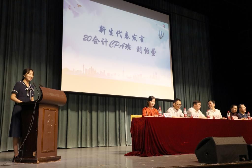 20级会计学(CPA Canada)专业的刘怡萱作为新生代表进行发言,她表达了自己作为商院新生的笃学之志与追梦之心,呼吁同学们始终践行“实事求是、经世致用”的八字校训。