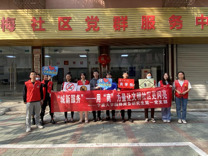 为鼓励学生党员积极加入文明城市创建工作,以实际行动弘扬志愿者服务精神,提升城市“文明指数”,为宁波市创建文明城市贡献力量。10月26日,我院国际商务专业研究生第一党支部在孔浦社区开展了“城新服务”——用“商”力量让文明社区更闪亮活动。