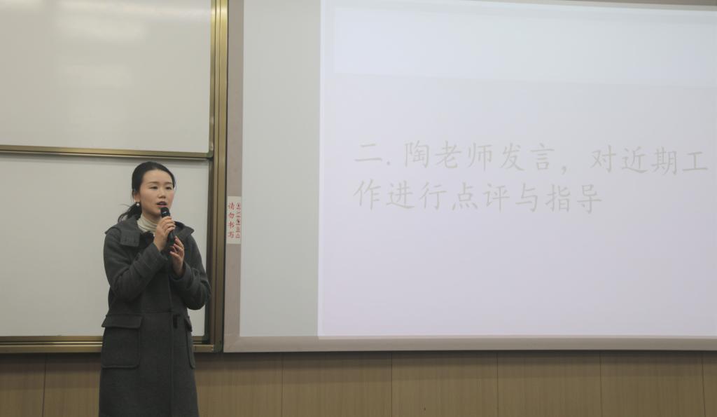 大会伊始,陶含怡首先对工作室前任主任与部长们的到来表示欢迎,她充分肯定了半学期以来工作室的工作成果,提到了在工作室各部门的努力下,学院新闻宣传工作逐见成效,成员们也各司其职、辛勤工作。与之同时,陶含怡也对同学们的个人发展与工作室的未来规划提出了一些建议,她提出,第一,积极谋求个人发展。风华工作室将不同年级、专业的同学凝聚在一起,成员间可以在学习、生活、技能方面进行交流与学习。第二,努力彰显部门特色。希望各部门扎实开展技能培训,多多记录培训活动、工作历程,开设更多的部门特色活动,展现风华工作室部门风采。第三,认真打造工作室品牌。风华工作室在保持当前的高效工作效率的同时,需要考虑如何与党建团学活动相结合,拓展工作业务,服务于学院广大师生。