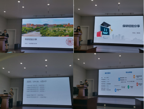 接下来,杨丹萍主任肯定了18级国贸全体在今年升学方面取得的良好成绩,指出这一成绩离不开国贸系这一优秀团队内各位老师以及辅导员的辛勤付出,离不开各位同学自身的努力奋进。此次升学交流会,表彰了18级考研、留学成功的同学。并且,升学成功的同学为19、20级的同学带来了一场精彩的经验交流会,根据自己的升学经历,为接下来有升学计划的同学提供了宝贵经验建议。