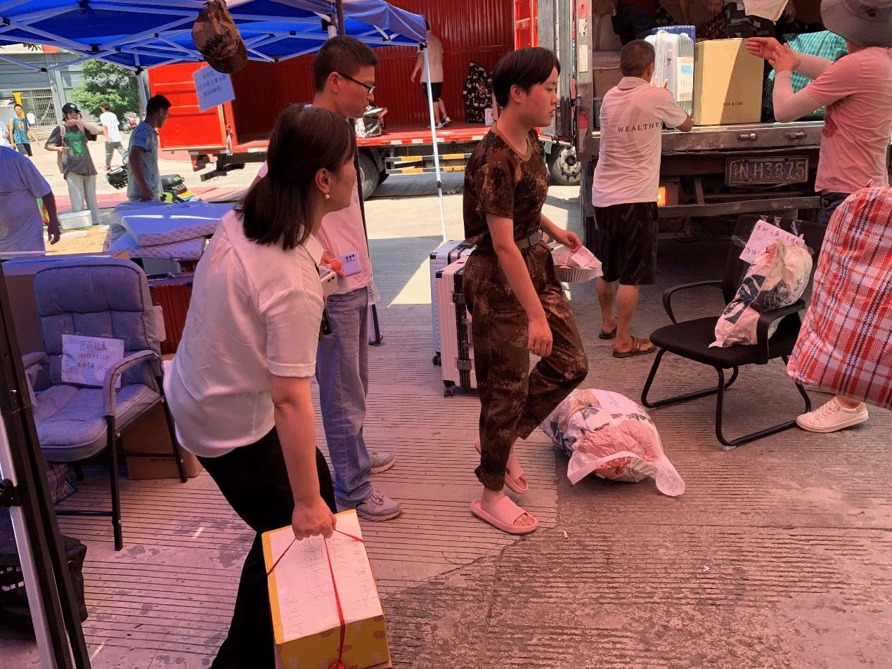 搬迁寝室当天,同学们积极配合学院工作,相互帮助提醒,有序开展搬迁工作。志愿者们与同学们一起搬运物品、清查宿舍,及时解决学生在寝室搬迁过程中遇到的各种问题。由学院学生会成立的志愿者大本营,在志愿点学院提供行李袋,绿豆沙饮品、藿香正气水等,贴心为同学们提供服务,在炎炎夏日送来一份清凉,送来一份贴心。