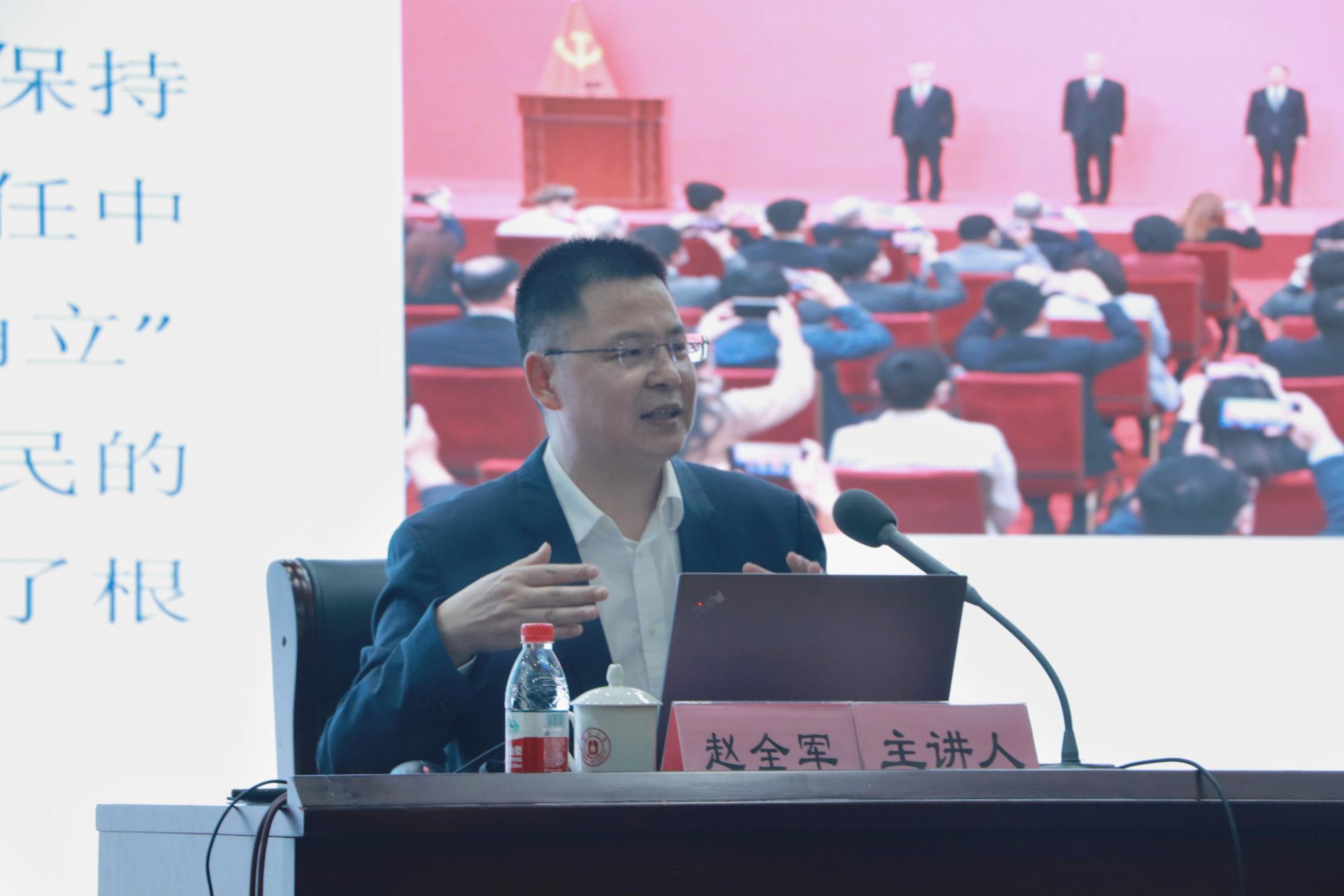 11月22日晚,副校长赵全军在真诚图书馆报告厅为电竞博彩 、阳明学院250余名学生讲授“形势与政策”课,我院党委书记史宏协主持。