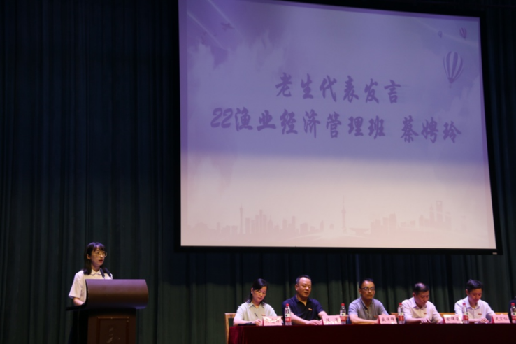 22级渔业经济管理专业的蔡娉玲作为老生代表发言。蔡娉玲学姐向商院里的学弟学妹们提出了三点要求,希望能给大家带来一些启迪:首先,要明确目标,风雨兼程,目标越清晰,我们在前进过程中的准备也就越充分;其次,实事求是,经世致用,我们在学习过程中要学会深入思考,去尾存真,由此及彼;最后也要增强体魄,保持个人身心健康发展,养成健康的生活作息习惯,塑造一个良好的心理素质。
