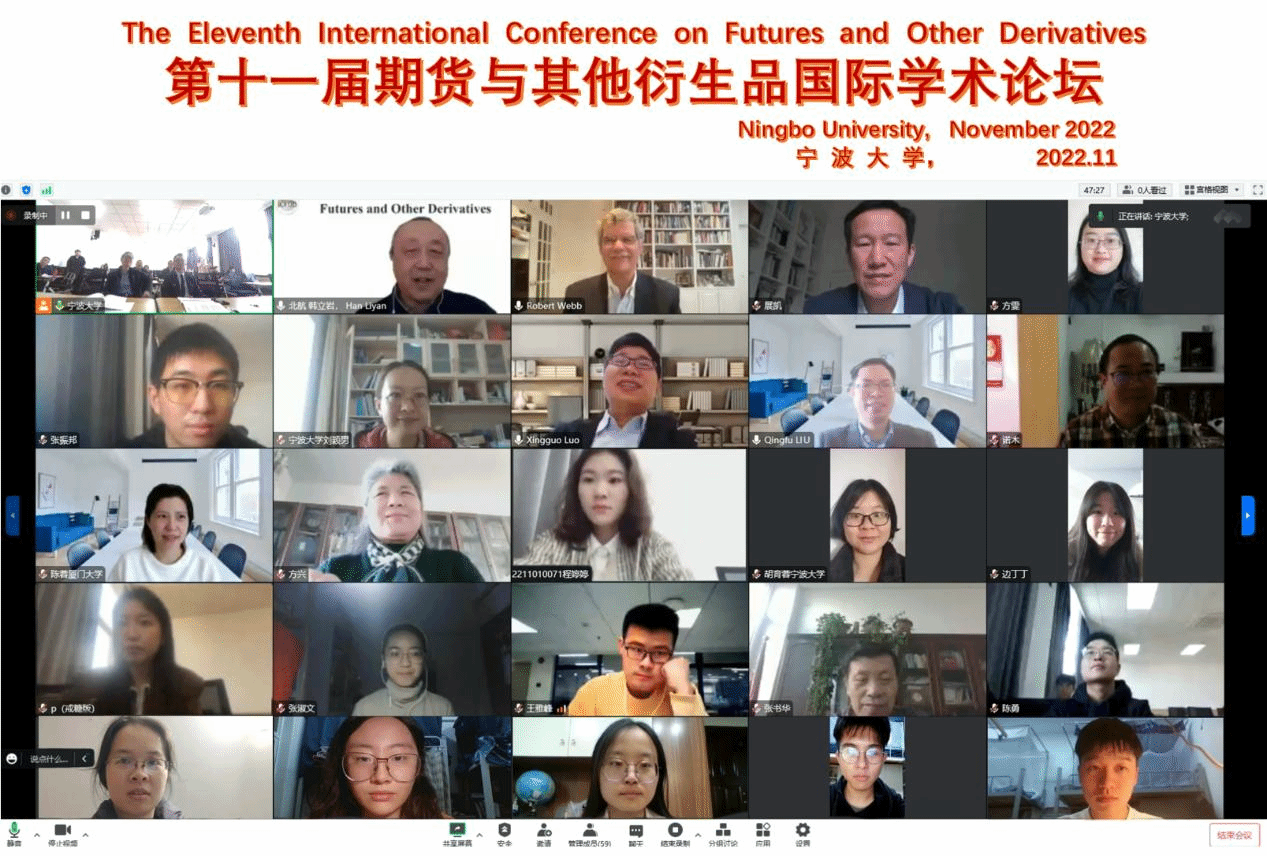 2022年11月5日至6日,第十一届期货与其他衍生品国际学术论坛在宁波大学以线上与现场的混合模式顺利举行。 会议由宁波大学主办,电竞博彩-国内电竞博彩 、宁波大学可持续金融研究中心和(浙江省新型智库)宁波大学中东欧经贸合作研究院共同承办。电竞博彩-国内电竞博彩 盛沛锋副院长出席开幕式并致欢迎辞,美国弗吉尼亚大学Robert Webb教授及厦门大学陈蓉教授作精彩的大会主旨演讲。宁波大学可持续金融国际研究中心主任章勇敏教授与北京航空航天大学的韩立岩教授担任本次论坛的共同主席,并主持了欢迎仪式及大会主论坛。