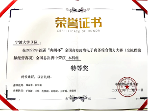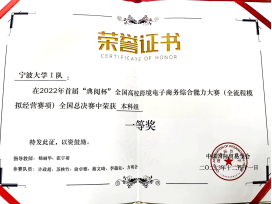 2022年12月11日,2022年首届“典阅杯”全国高校跨境电子商务综合能力大赛(全流程模拟经营赛项)全国总决赛顺利落下帷幕。在我院杨丽华老师、张宇萌老师的带领下,由宁波大学跨境电商微专业学生组成的宁波大学1队、2队、3队在比赛中荣获特等奖、一等奖及二等奖的优异成绩。这是我院近年来高度重视创新型人才培养工作,大力实施校企深入合作,协同育人所取得的喜人成果。