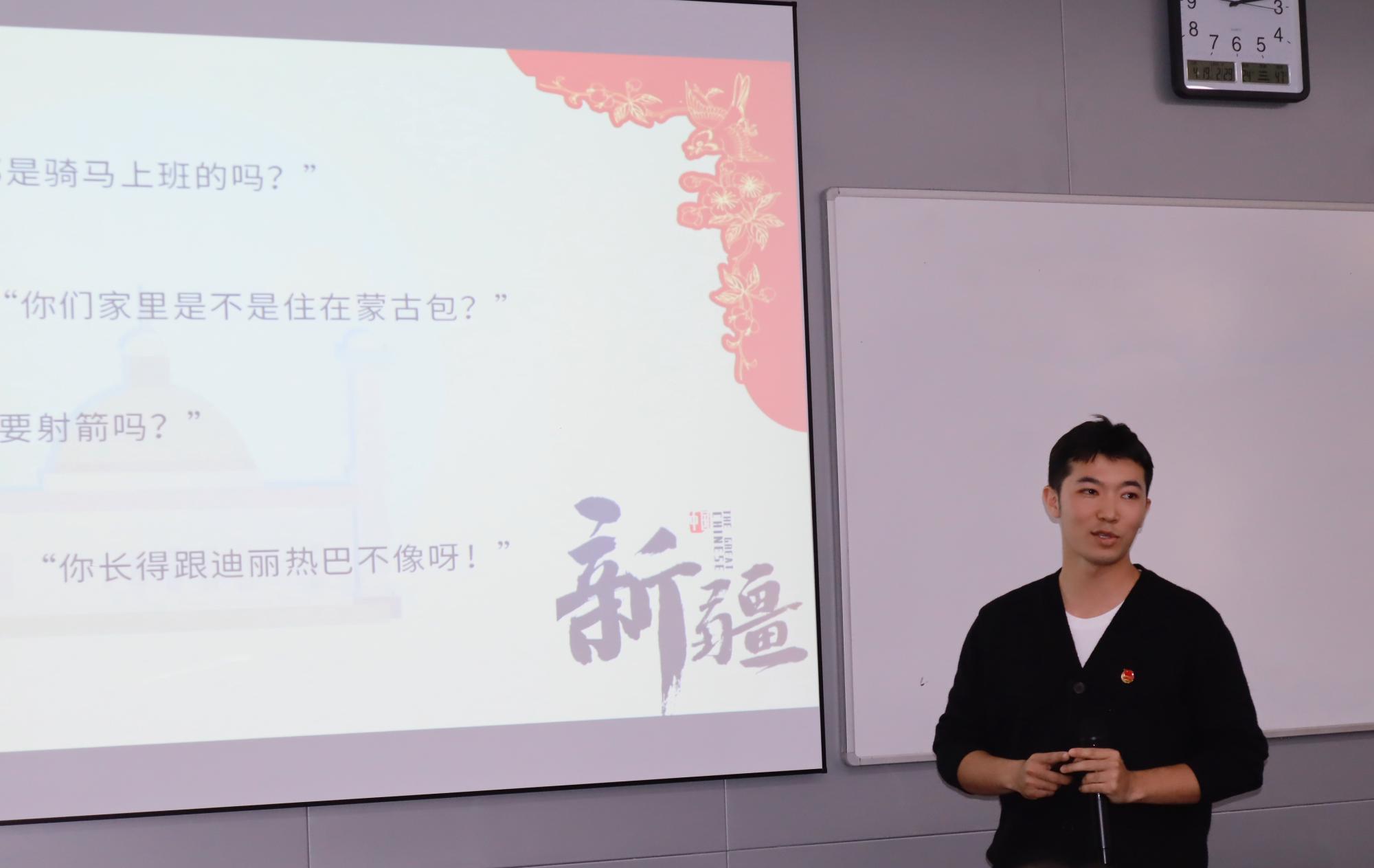 讲座的第三部分以“我心中的新疆”为主题,由“飞越”甬疆实践宣讲团成员司衣木克同学主持,他以生动有趣的事例带领同学们领略新疆的美好风光,最后号召同学真正走进新疆,深入了解新疆。