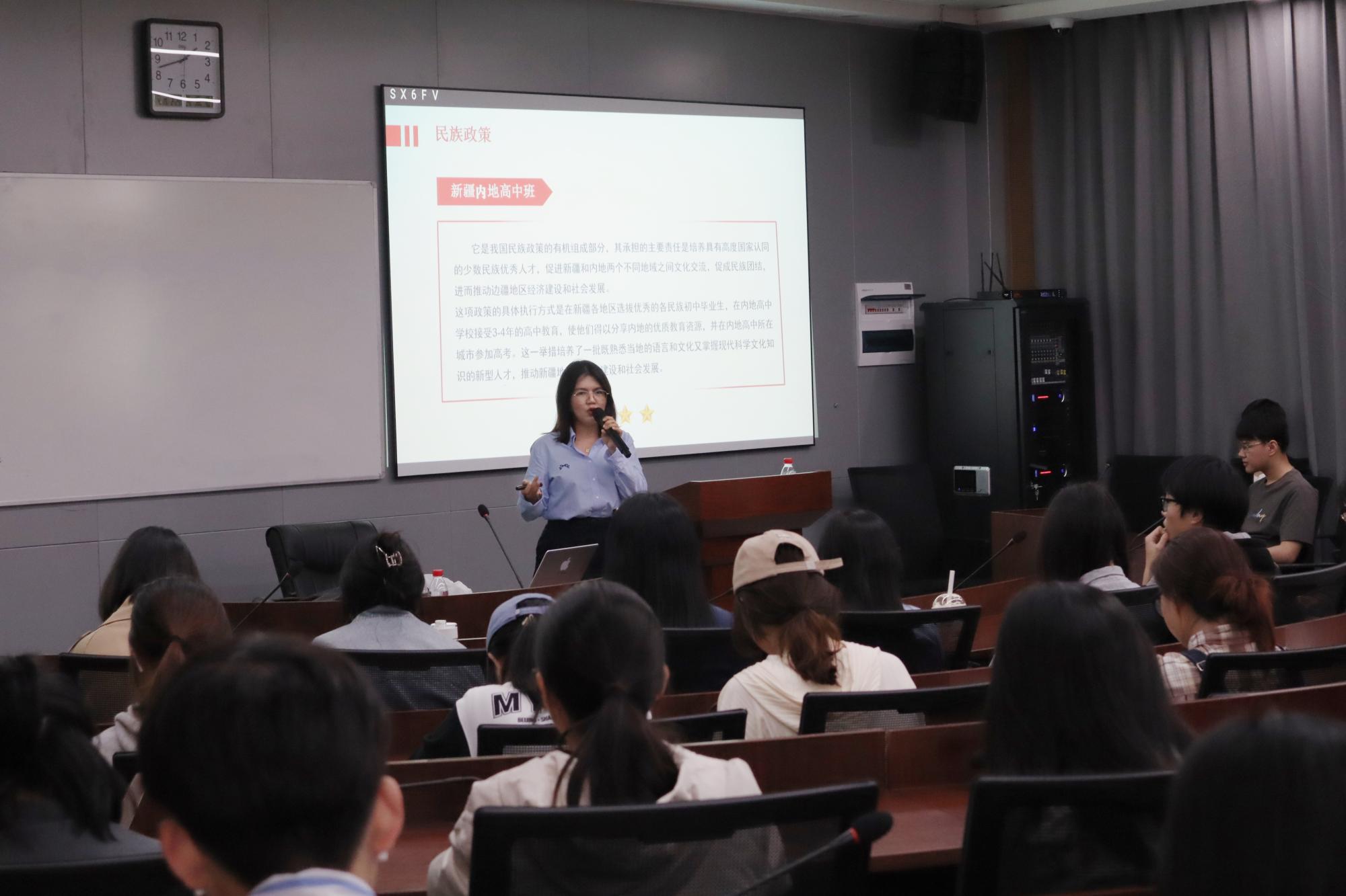 讲座伊始,“飞越”甬疆实践宣讲团指导老师麦尔阿巴结合自身例子介绍新疆部分少数民族姓氏组成、在新疆内地高中班的学习经历,并分享了自己对于民族团结的理解。