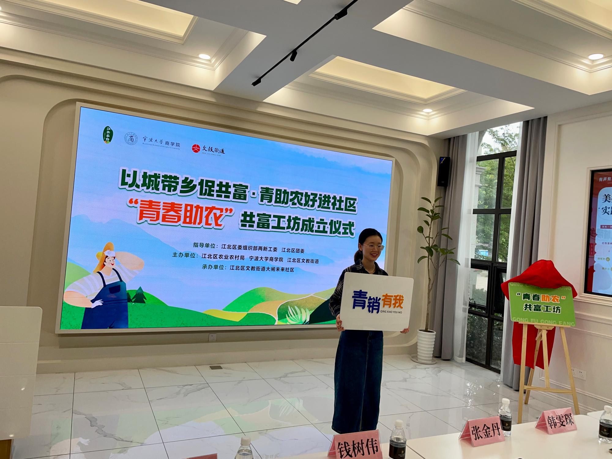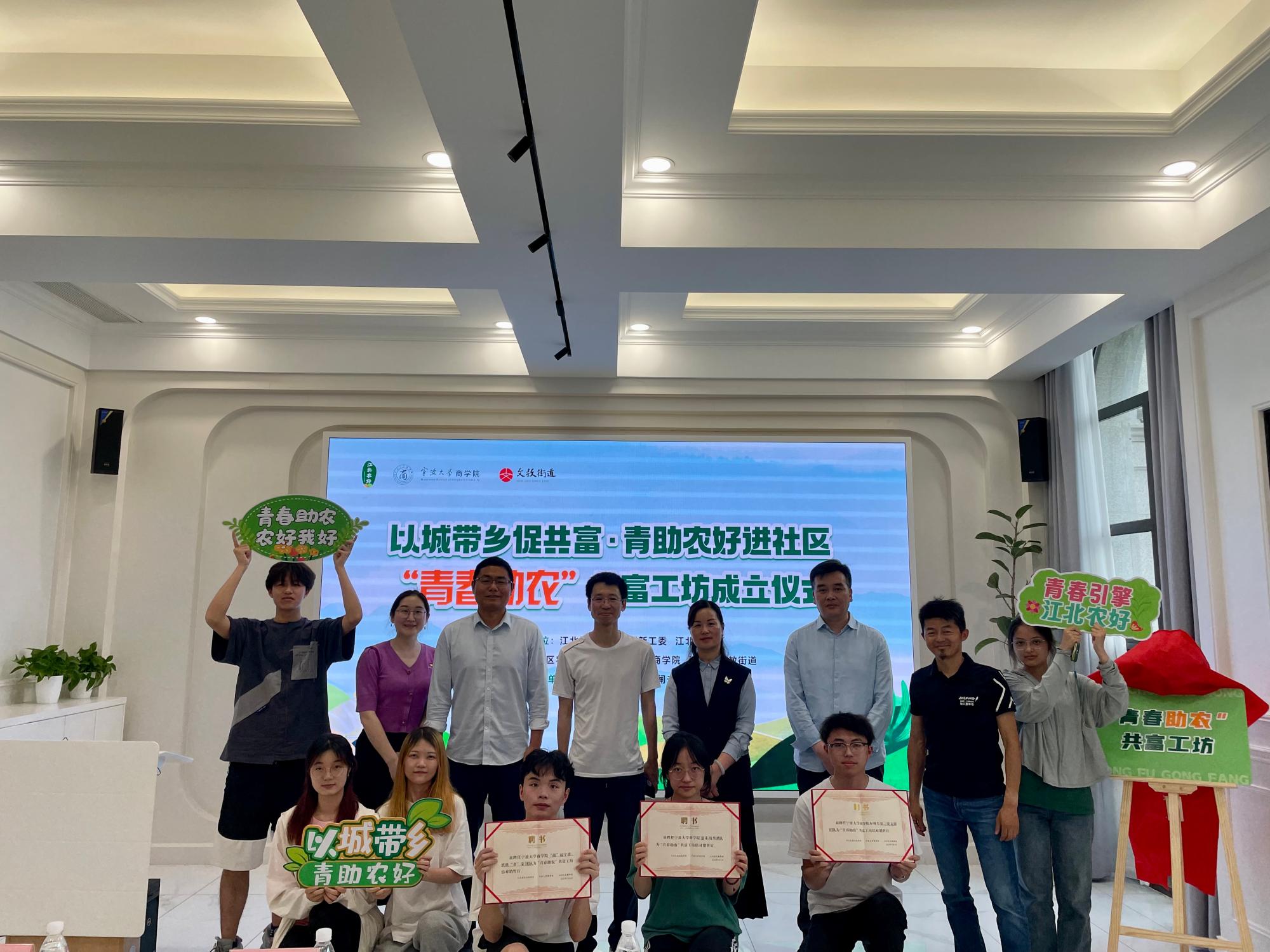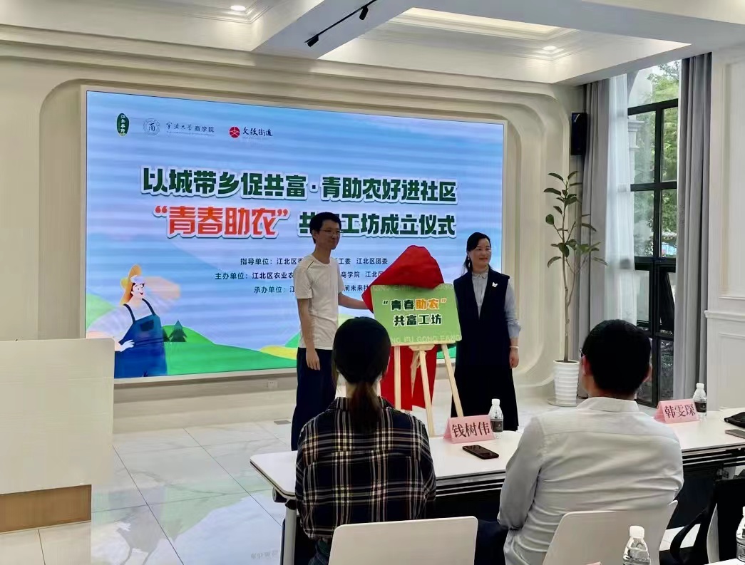 5月4日下午,五四青年节这天,由电竞博彩-国内电竞博彩 、江北区农业农村局和江北区文教街道联合建设的“青春助农”共富工坊在大闸未来社区正式揭牌成立,这也是我院青年深入学习贯彻习近平新时代中国特色社会主义思想,助力乡村振兴、带动共同富裕行动的一个生动实践。
