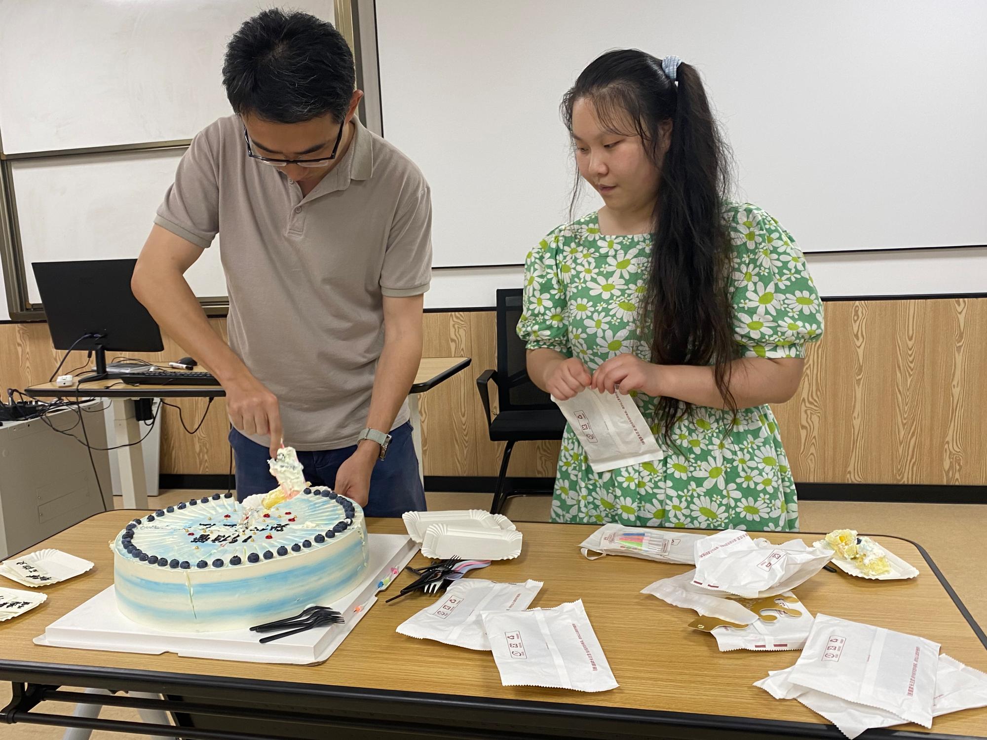 随后,同学们领取了纪念徽章,班主任王昕天老师为同学们分切了蛋糕,这是一份纪念,也是一份美好的回忆,希望同学们在未来回忆起大学生活,能够再度感受到这份温暖的心情。也希望这份心情能成为大家心中的一股力量,促使大家不断地向前进。