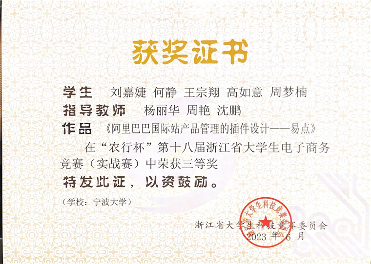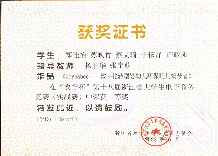 5月28日,“农行杯”第十八届浙江省大学生电子商务竞赛暨第十三届全国大学生电子商务“创新、创意及创业”挑战赛浙江省选拔赛落下帷幕。宁波大学跨境电商微专业由杨丽华、张宇萌老师指导,郑佳怡、苏映竹、蔡文琦、于依泽、许政阳同学参与的作品《Heybabee——数字化转型婴幼儿环保玩具筑梦者》荣获跨境电商—阿里巴巴国际站赛二等奖;由杨丽华、周艳、沈鹏老师指导,刘嘉婕、何静、王宗翔、高如意、周梦楠同学参与完成的《阿里巴巴国际站产品管理的插件设计——易点》获得跨境电商—阿里巴巴国际站赛三等奖。这也是跨境电商微专业学生继首届“典阅杯”全国高校跨境电子商务综合能力大赛全国总决赛斩获佳绩后,第二次在该项赛事中获奖。