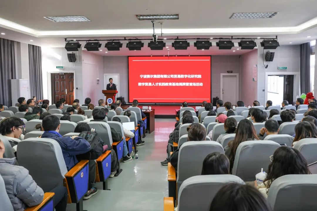 12月13日,由国贸系与宁波赛尔集团共同举办的宁波赛尔集团有限公司贸易数字化研究院暨数字贸易人才实践教育基地揭牌活动在电竞博彩 501报告厅举行。来自校内师生代表及校外嘉宾共180多位参与此次活动。其中校内外嘉宾主要有宁波市政府发展研究中心主任张健、宁波大学党委副书记赵全军、宁波市工商联副主席吴益统、宁波市工商联副主席、赛尔集团董事长徐平炬、浙江大学中国数字贸易研究院院长马述忠、电竞博彩-国内电竞博彩 党委书记史宏协、民建宁波市委会副主委、宁波大学国际贸易所所长杨丽华、市工商联研究室主任陈斌、一级主任科员孟云飞、市商务局服务贸易处处长鲍伟伟、市贸促会贸易促进部部长徐志伟、赛尔集团副总裁方永强、赛尔集团市场研究部总经理兼贸易数字化研究院院长孟祥龙、赛尔集团信息技术部副总经理纪福建、宁波东方理工大学助理教授金鑫等领导和嘉宾出席仪式。国贸系参与此次活动的教师代表还有系主任丛海彬教授,青年教师有夏良科、伍湘陵、钟建军及王腾飞。