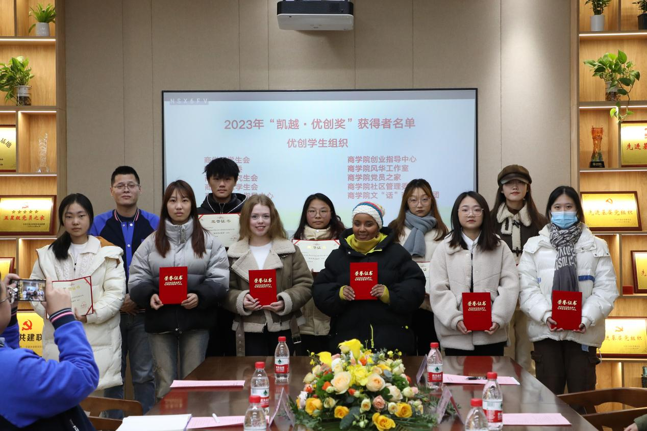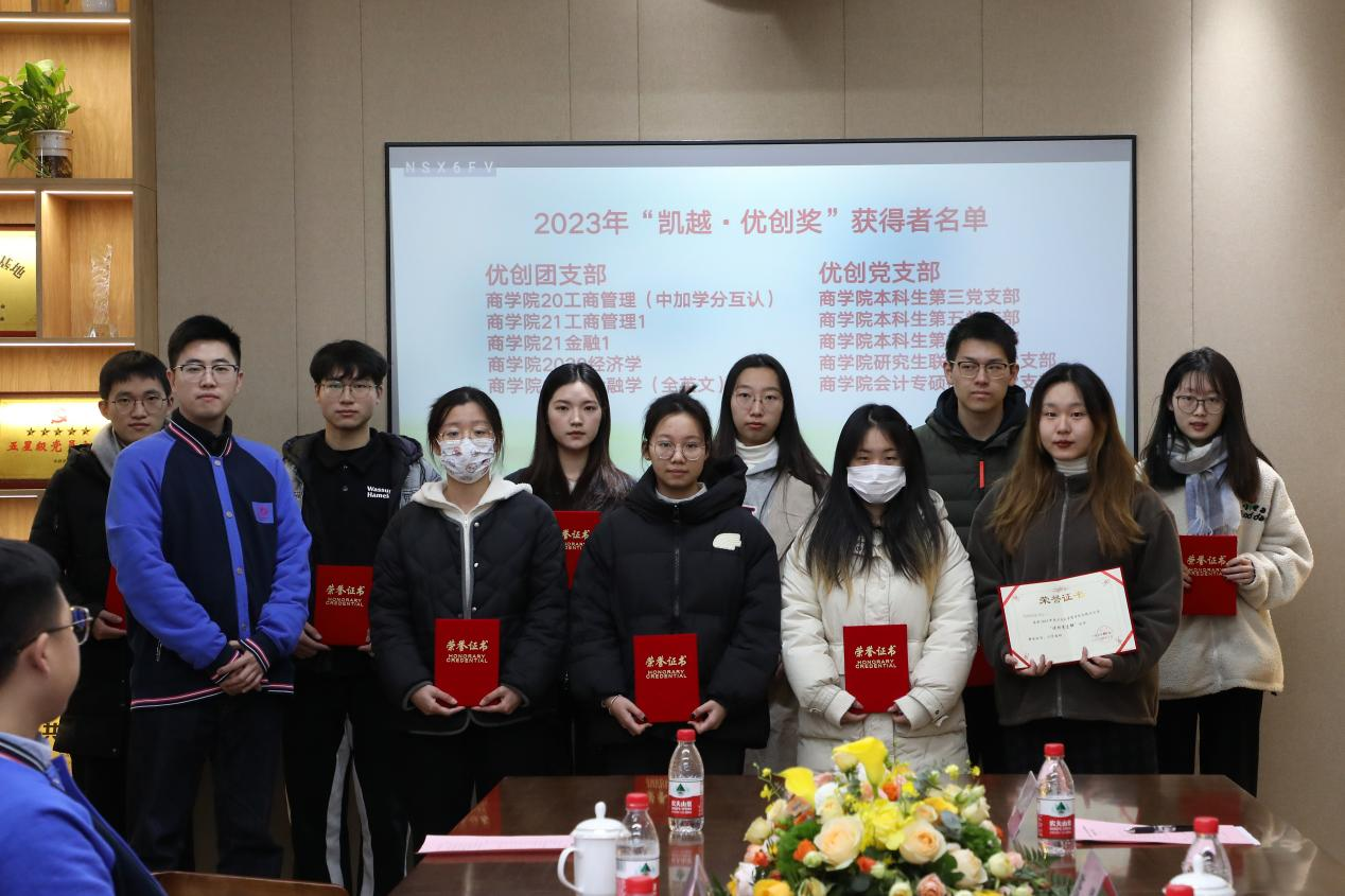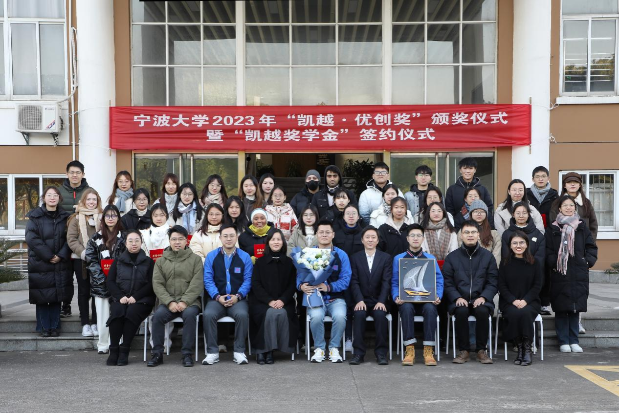 12月21日下午,宁波大学2023年“凯越·优创奖”颁奖仪式暨“凯越奖学金”签约仪式在我院党员之家举行,凯越集团总裁助理朱吉,凯越集团人事部副经理王忠宇,凯越集团人事部经理助理戴陟遥,电竞博彩 党委书记史宏协,党委副书记韩雯琛,宁波大学校友办陈煜,电竞博彩 学工办主任陈彬,电竞博彩 辅导员孙健维、麦尔阿巴以及获奖学生团队代表等40余名师生出席本次活动。