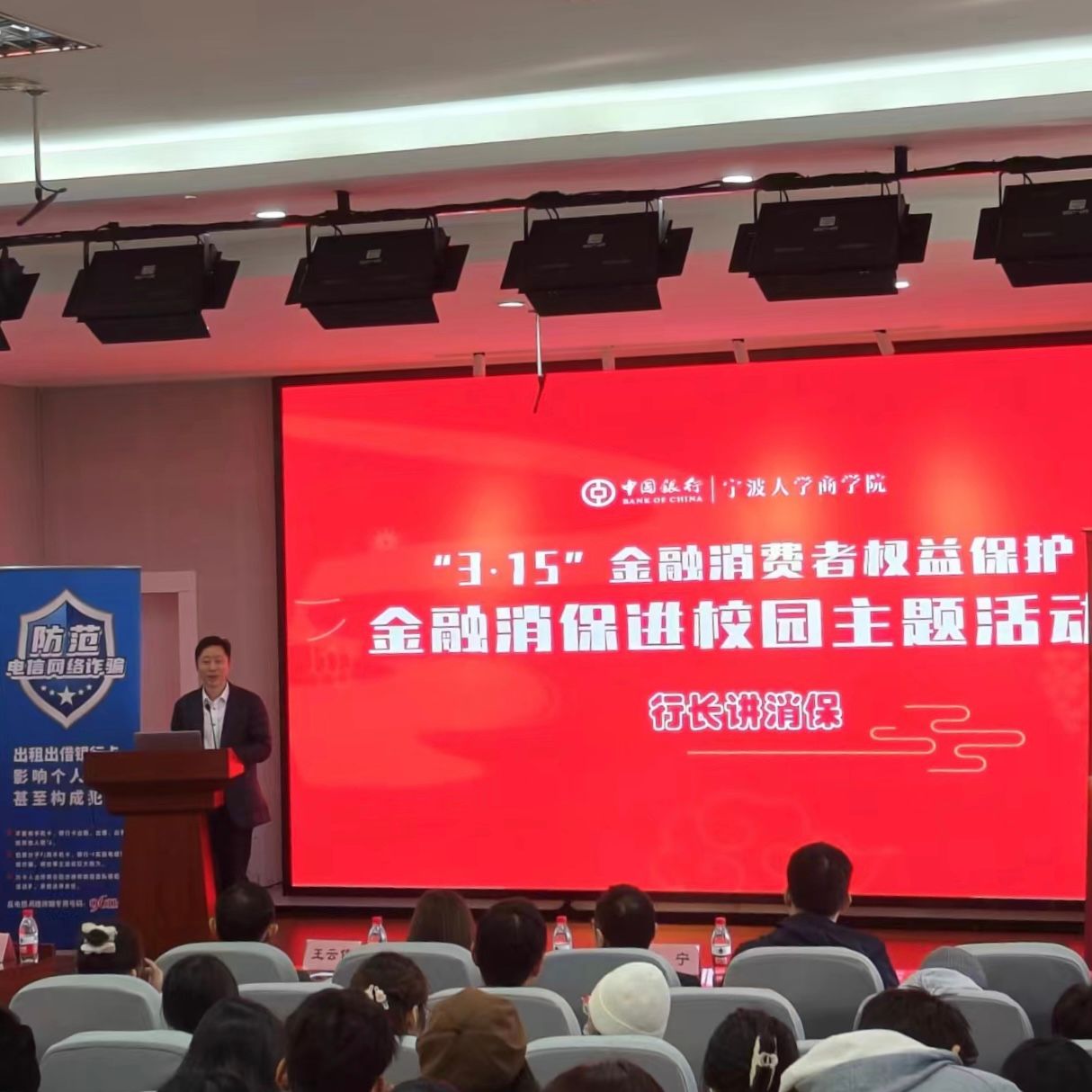 为更好地普及金融知识,切实帮助高校大学生掌握必备的金融知识和技能,提升风险防范意识和自我保护能力,3月13日下午,“金融消保进校园”反诈知识讲座在我院501报告厅顺利进行。本次讲座邀请中国银行江北支行行长、党委书记王云伟作为主讲人,学院党委书记史宏协、副书记韩雯琛出席,9名银行一线工作人员到场。