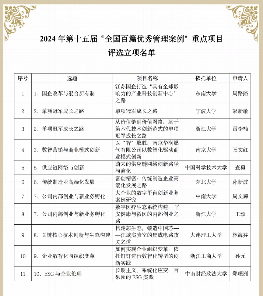 4月18日,第十五届“全国百篇优秀管理案例”评选重点项目立项评审会议在杭州顺利召开,我院彭新敏教授主持的《单项冠军成长之路》项目申请通过评审,获重点项目立项,这是彭新敏教授团队继在第十届和第十三届评选中取得佳绩后,再次获批立项。