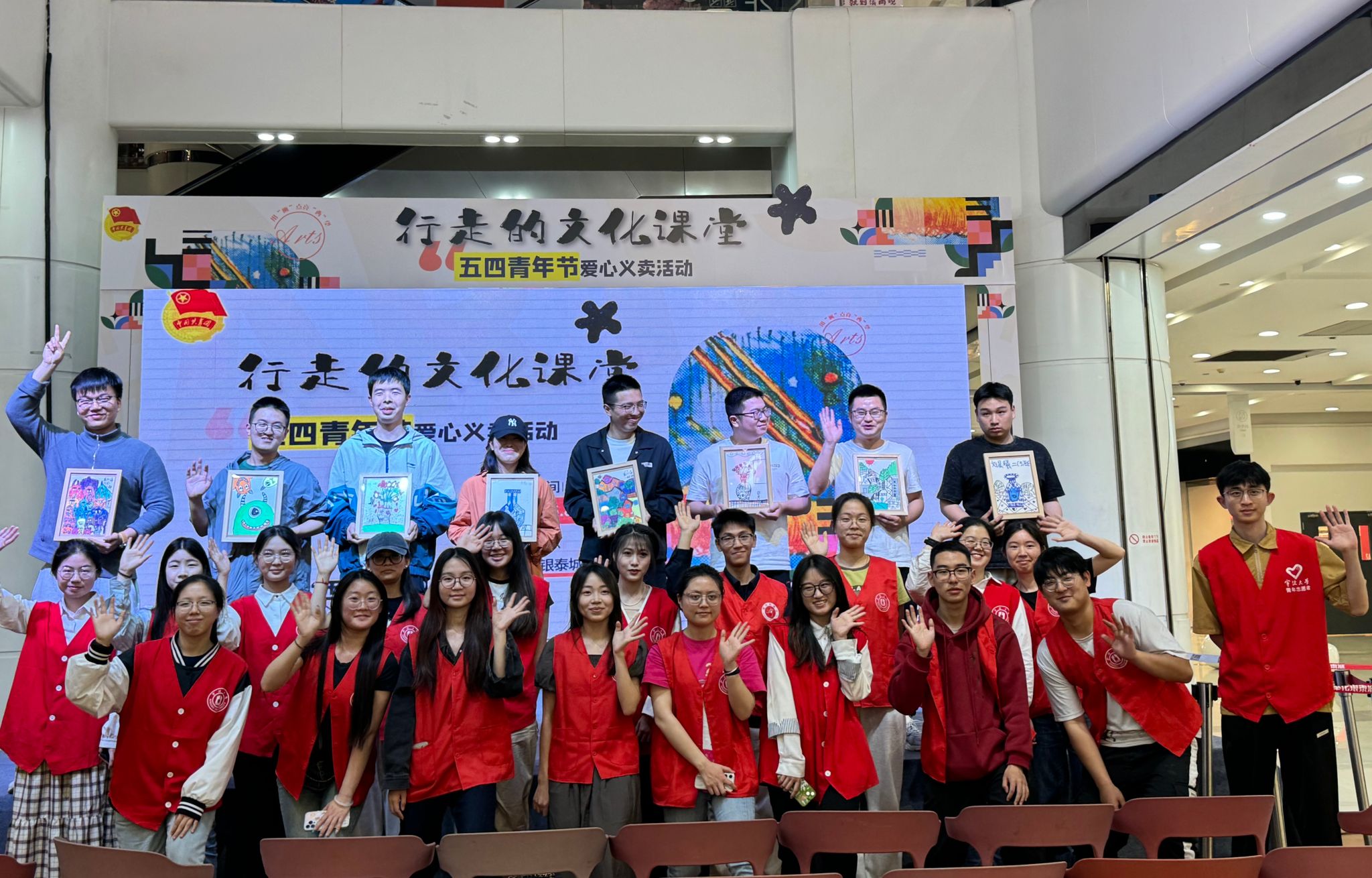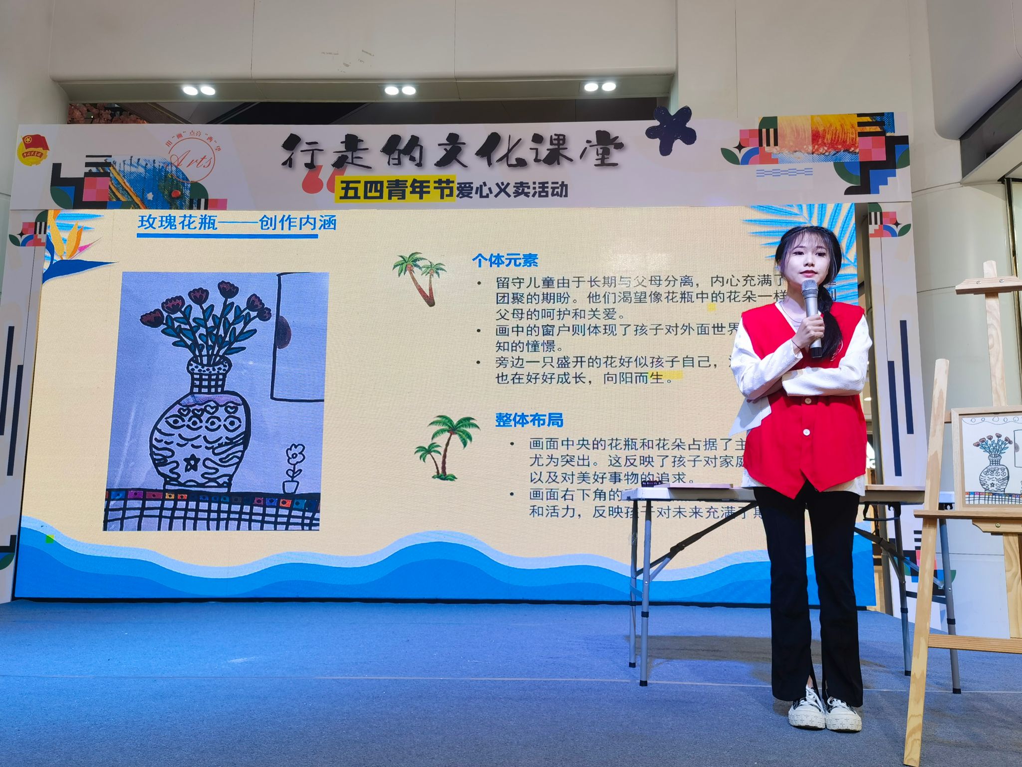 色彩交错的“霍比特房”、俏皮可爱的“小怪兽”、清新素雅的“宝特瓶”······5月8日下午,电竞博彩 《行走的文化课堂》五四爱心绘画作品义卖活动在宁波市奉化区银泰城火热举行,青年志愿者们穿上特色红马甲热情推销,有的激情演说招揽顾客,吸引众多家长和市民驻足购买。