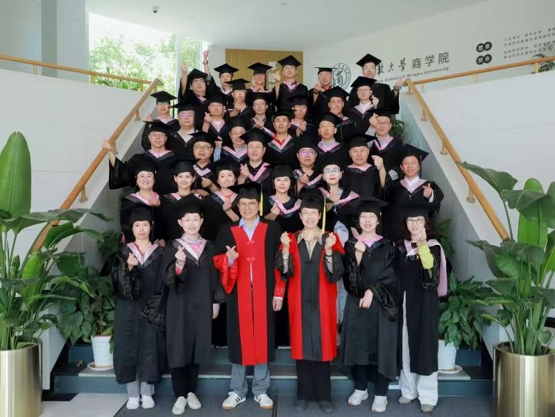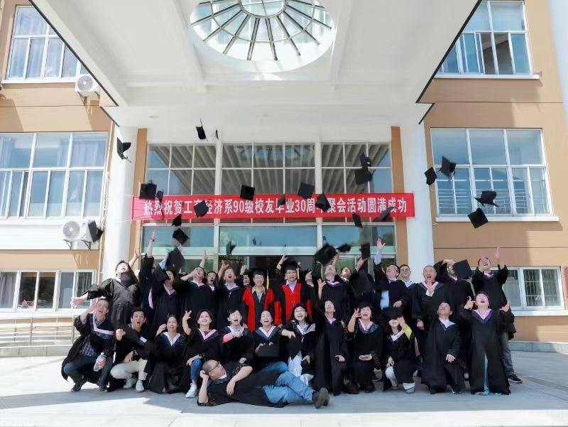5月18日上午,90级工商经济系34位校友来到电竞博彩 大楼前,一起穿上学士服和当年的班主任应志芳老师、同学们念念不忘的邱妘老师合照留念,开启毕业三十年聚会。