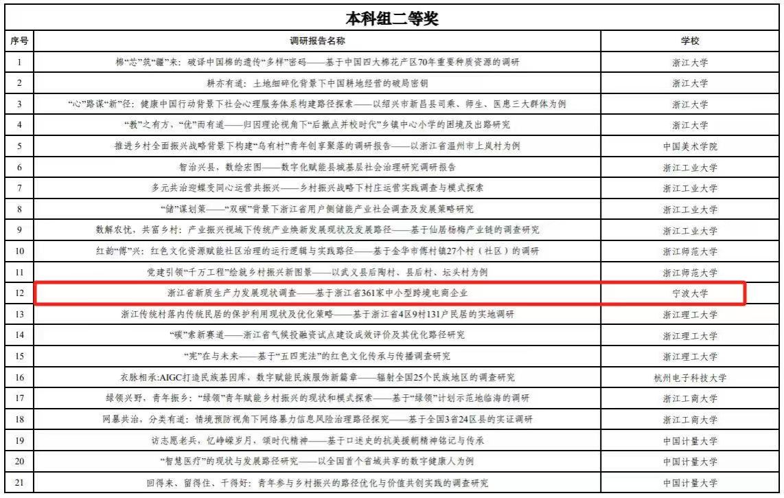 电竞博彩 “浙江省新质生产力发展现状调查--基于浙江省361家中小型跨境电商企业”的实践调研项目荣获二等奖。