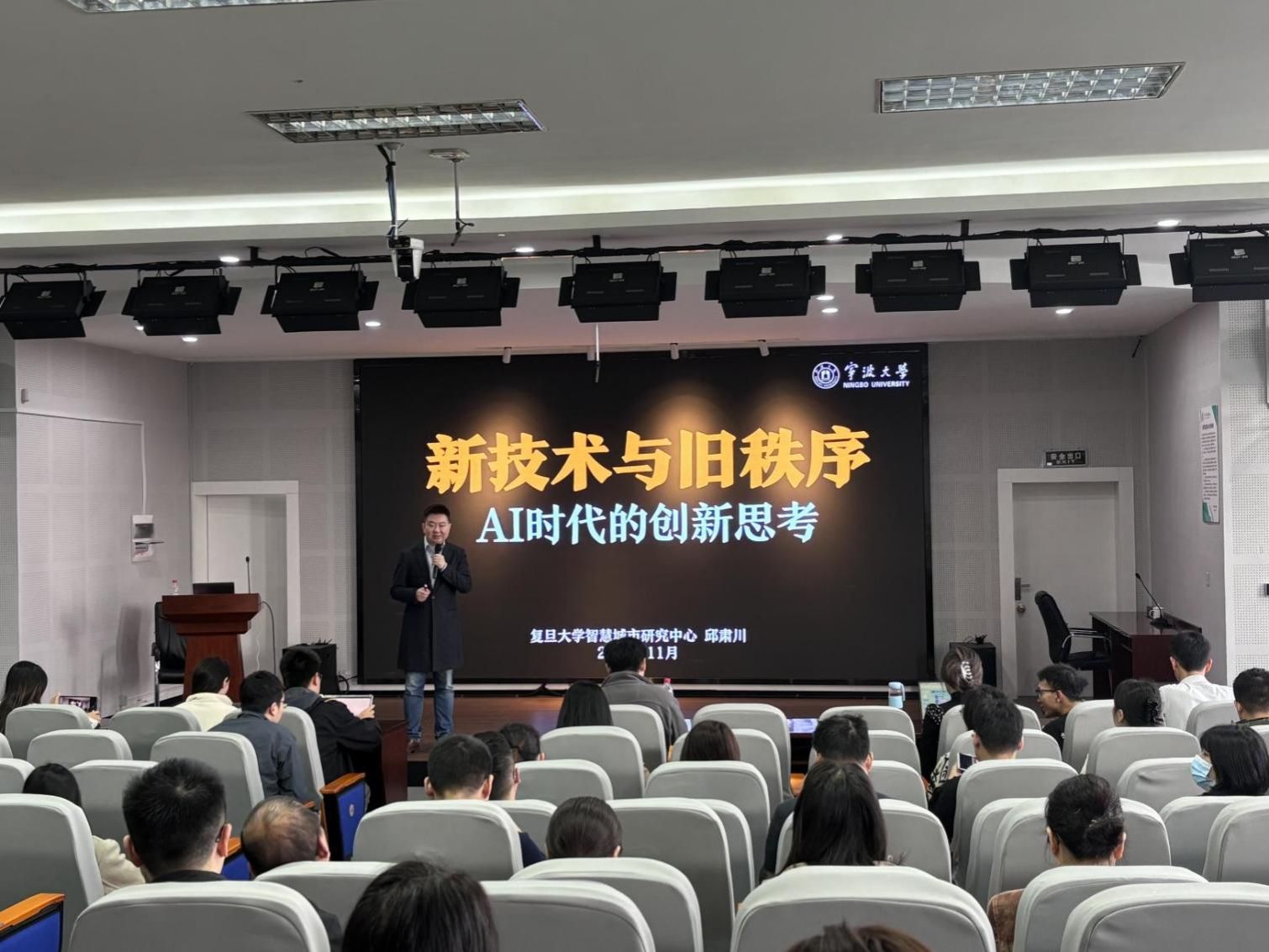 11月23日上午,宁波大学“名人、名师、名家”暨MBA第五十六期论坛在电竞博彩 501报告厅成功举行。本期论坛以新技术与旧秩序-AI时代的创新思考(人工智能的商业创新前瞻)为主题,特别邀请了复旦大学智慧城市研究中心高级研究员、上海复初企业管理咨询有限公司联合创始人邱肃川为主讲嘉宾。论坛由工商管理系张振教授主持,2024级MBA全体学员参加了此次论坛。首先,张振教授向同学们介绍了主讲嘉宾邱肃川,并对邱老师的应邀出席表示衷心的欢迎和诚挚的感谢。