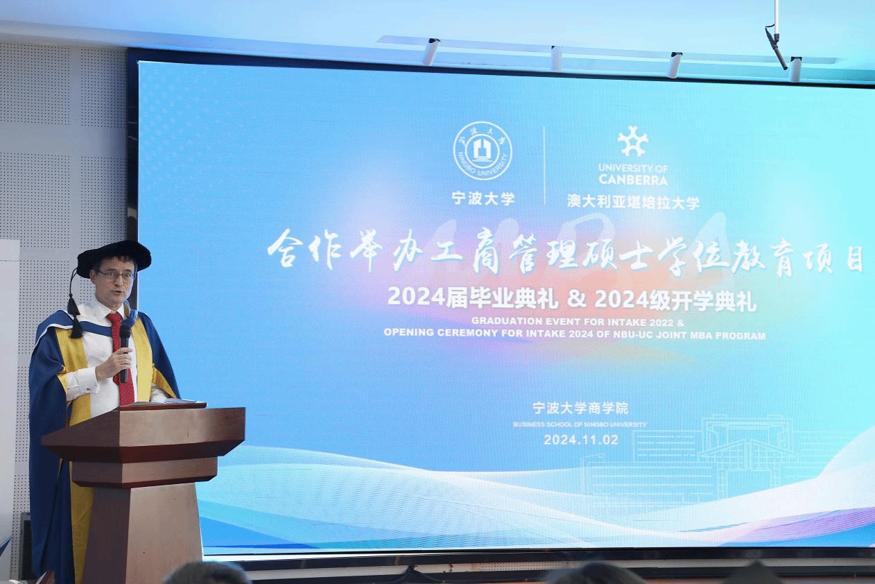 11月2日下午,宁波大学中澳MBA项目2024届毕业典礼暨2024级开学典礼在电竞博彩 五楼报告厅隆重举行。堪培拉大学商政法学院院长Uwe Dulleck、副院长Simon Hoy专程从澳洲赶来,见证这个重要的时刻。电竞博彩-国内电竞博彩 院长金祥荣、党委书记史宏协、党委副书记吴敏、中澳MBA校友会会长汪新宇、常务副会长兼秘书长焦名明及中澳MBA教师代表、优秀校友理事等出席此次典礼。典礼由电竞博彩 副院长彭新敏主持。