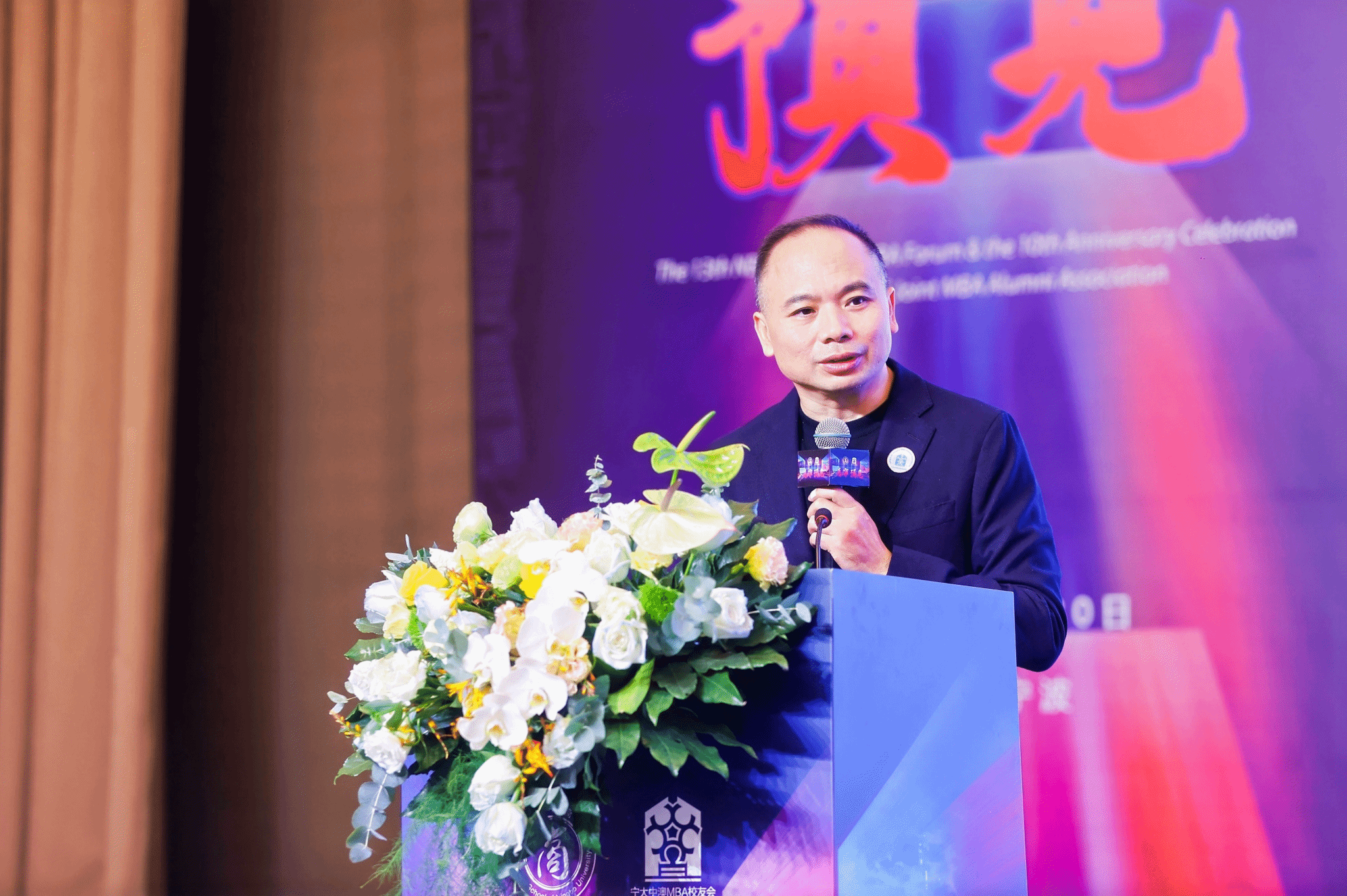 庆典典礼上,朱达书记首先致辞。朱书记向与会嘉宾和校友表示热烈欢迎,并对多年来关心和支持学校发展的各界人士表达了由衷的感谢。他提到,宁波大学中澳MBA项目始终致力于培养具有国际视野与实践能力的商业领袖。校友会通过组织各项活动,成为了校友、学校和校友企业的重要桥梁。“1+1模式6大板块活动”的推出也为三者之间的合作提供了宝贵平台。今年,校友会还荣获宁波大学2024年度“领航校友会奖”。朱书记还分享了近年来宁波大学在教学、科研和综合发展方面的显著成就。学校计划在2026年力争建成国内一流地方综合性大学,并希望校友们能一如既往关心学校建设,支持母校发展。他指出,本次论坛邀请了多位重量级嘉宾,定能为在场嘉宾们带来一场创新思维的思想盛宴。最后,他预祝本次论坛和庆典活动圆满成功。