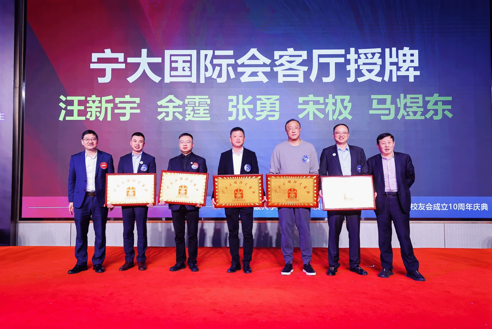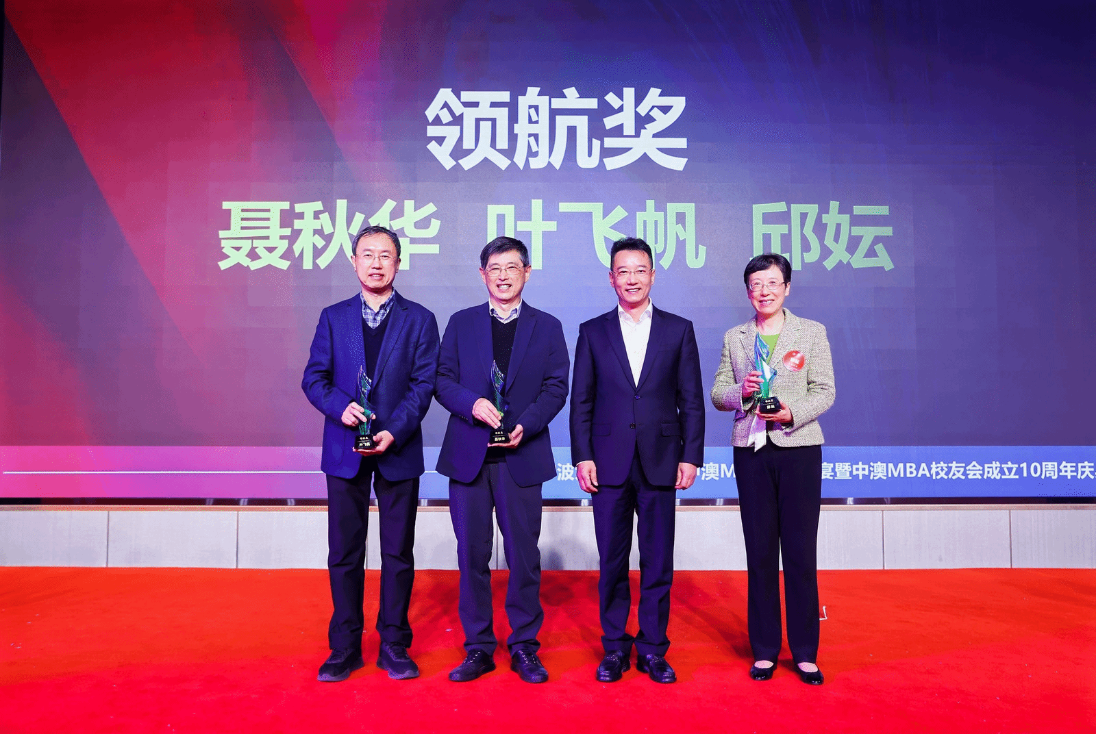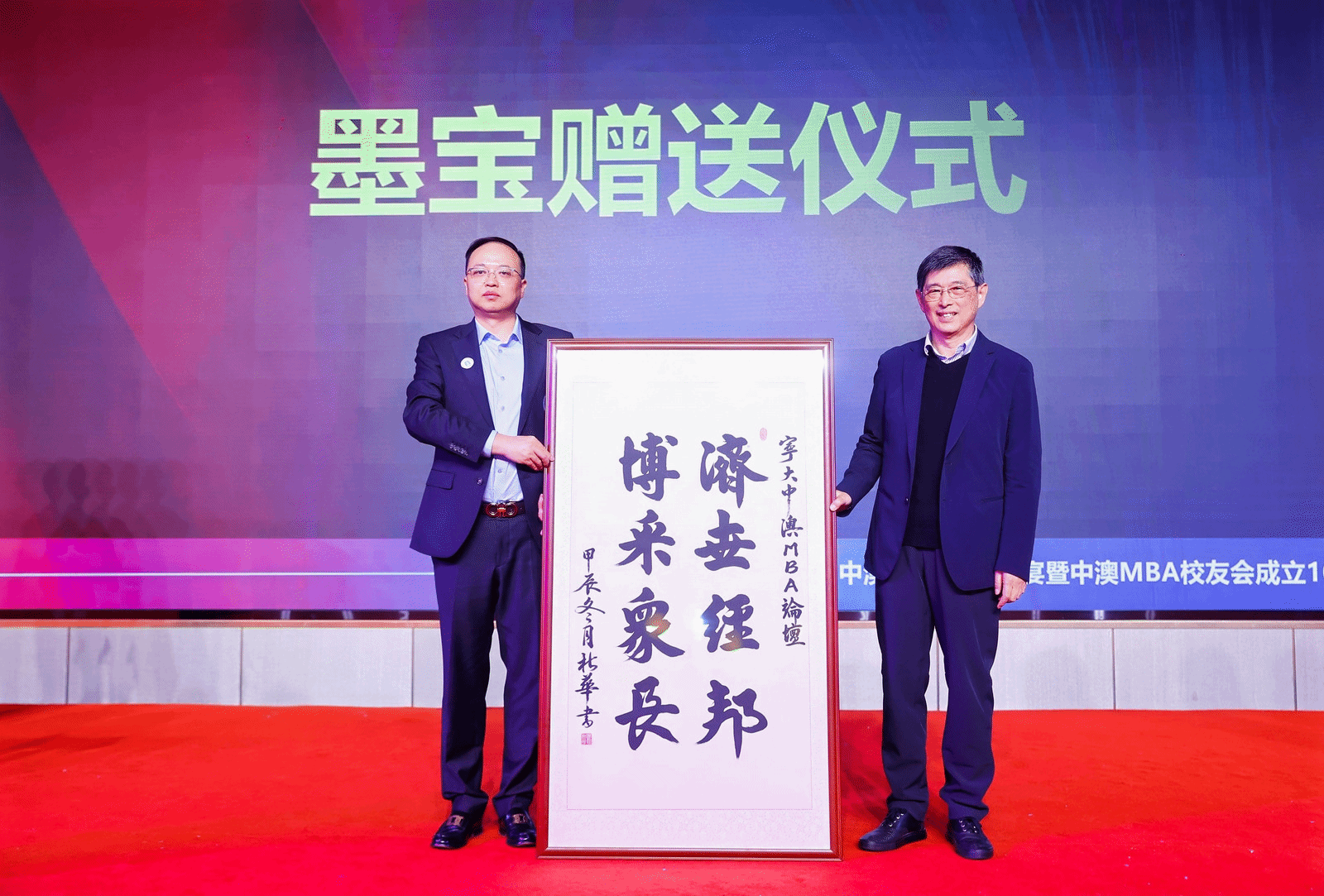 论坛结束后,举办了校友晚宴。宁波大学校友会会长聂秋华用十个“精”高度评价了此次论坛的举办,并向中澳MBA校友会赠送了亲手书写的墨宝“博采众长,济世经邦”。年会还对为项目建设和校友会发展做出卓著贡献的校友老师和本次活动的赞助单位进行了表彰,颁发了领航奖、伯乐奖、学科建设贡献奖、贡献至尊奖、贡献卓越奖、筹备贡献奖等奖项,并进行了校友会活动“1+1模式授旗仪式”及“宁大国际会客厅”授牌仪式。