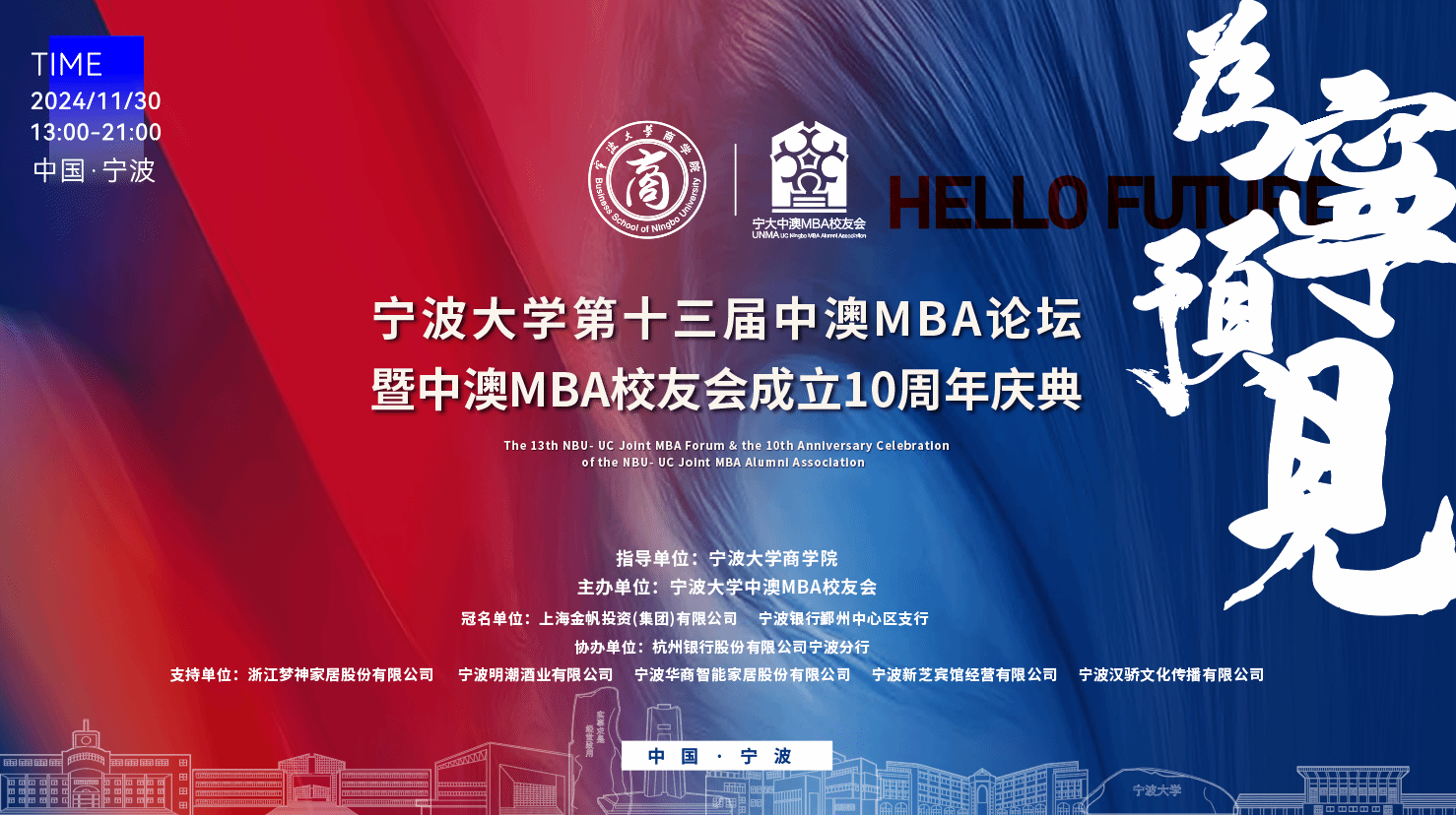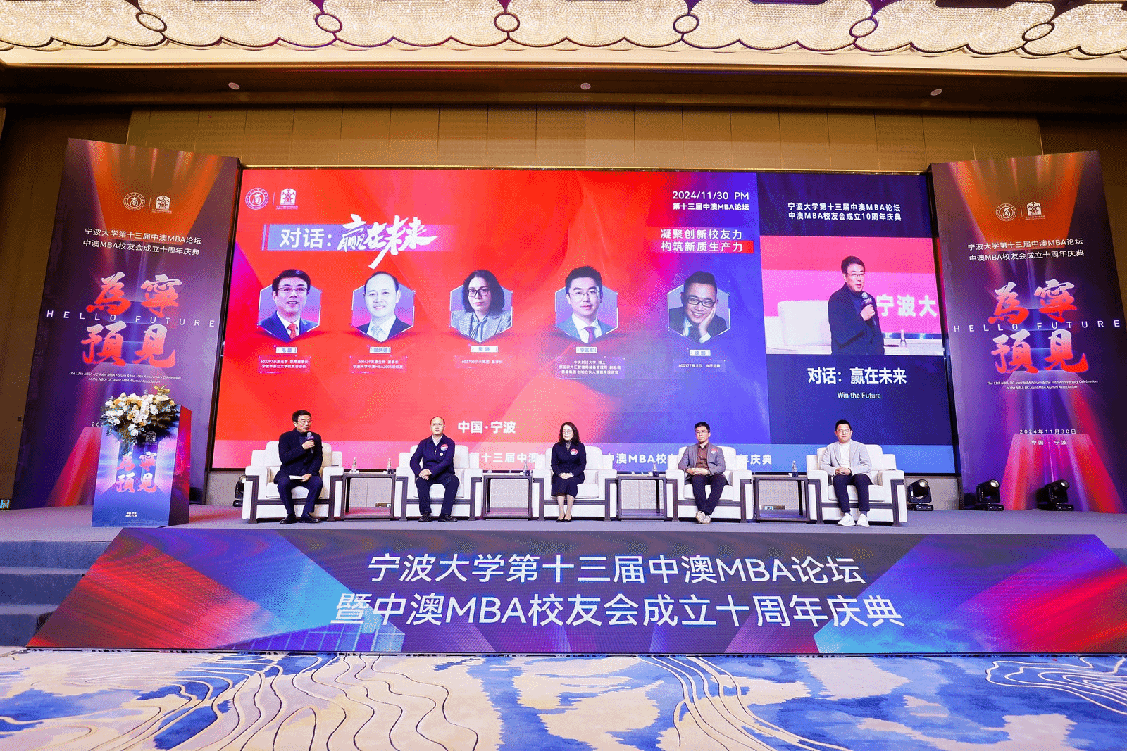 2024年11月30日下午,“为宁预见”宁波大学第十三届中澳MBA论坛暨中澳MBA校友会成立十周年庆典在宁波新芝宾馆成功举办。本次活动由电竞博彩-国内电竞博彩 指导,宁波大学中澳MBA校友会主办。宁波大学党委书记朱达、宁波大学党委副书记张真柱、宁波大学党委委员兼宣传部长余怡春、宁波大学校友会会长聂秋华、宁波大学校友会顾问叶飞帆、宁波大学校友会副会长冯志敏、宁波大学校友会副会长兼秘书长胡宝华、永新光学董事长兼宁波市浙大校友会会长毛磊,美康生物董事长、宁波大学中澳MBA2005级校友邹炳德,宁水集团董事长张琳,原国家外汇管理局储备管理司副总裁、思睿集团创始合伙人兼首席投资官李富军,雅戈尔执行总裁徐鹏等出席本次论坛。论坛由电竞博彩-国内电竞博彩 党委书记史宏协主持。活动还特邀了著名经济学家刘煜辉、奥运冠军孙杨,与现场领导、校友及兄弟校友会代表、各界嘉宾等总计400余人欢聚一堂,共同庆祝中澳MBA校友会成立十周年。