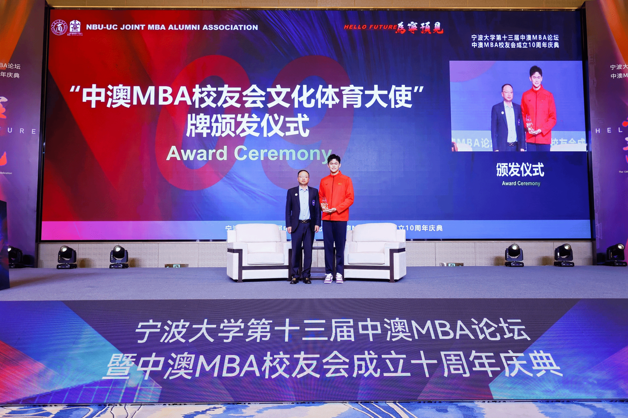 接下来,在现场全体嘉宾和校友们共同见证下,宁波大学中澳MBA校友会会长汪新宇先生向著名游泳健将、奥运冠军孙杨先生颁发了“宁波大学中澳MBA校友会文化体育大使”的表彰牌。随后,电竞博彩 党委副书记吴敏主持并邀请孙杨作体育和商业主题分享,与众人共同探讨体育在推动经济增长、促进社会进步方面的多维度价值。他首先结合宁波本地制造业、外贸产业发达,GDP发展迅速的特点,认为宁波大学具有人才储备充足的优势,期待与校友们共同在体育事业方面创造更多就业机会。接下来,他以大型体育赛事的经济影响为切入点,探讨奥运会、世界杯等赛事如何推动举办地的经济增长,提出要利用好赛后场馆,实现运营化、数字化、科学化管理。实现传统体育破圈,让体育产业走进学校,拓宽未来发展空间,实现体育事业的智能迭代。最后,他讲述了自己今后的计划是走进校园、开展体育活动,同时类比企业和体育竞技,都要秉承奥运精神,突破困难,穿越周期。吴敏副书记也祝愿今后宁波大学能与孙杨先生有更多深度的合作。