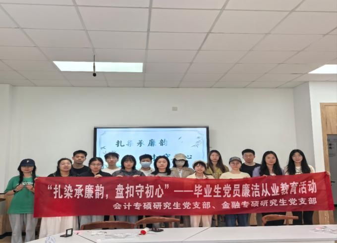 4月11日,我院会计专硕研究生党支部联合金融专硕研究生党支部在曹光彪楼216教室开展“扎染承廉韵,盘扣守初心”毕业生党员廉洁从业教育活动。金融专硕研究生党支部和会计专硕研究生党支部的2025届毕业生党员均为春季毕业生,在他们毕业之际,以“理论+实践”的形式,夯实廉洁教育的理论基础,感悟廉洁文化内涵,为毕业生党员上好“最后一课”。