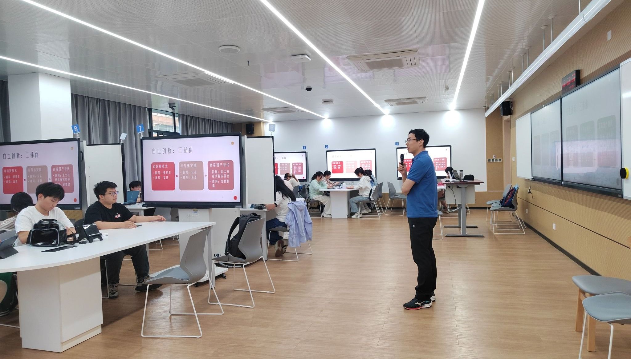 课后督导组吕建锁老师主持了交流研讨。参与研讨的老师们对刘电光老师的课程设计给予了高度评价。大家一致认为,刘老师精心选取了高铁、华为海思、永新光学三个具有代表性的案例故事,通过引导学生开展头脑风暴,鼓励他们进行发散思维,成功营造了一个活跃而富有创造力的课堂氛围。更为重要的是,思政元素在课程中得到了自然且巧妙的融合,让学生在学习专业知识的同时,深刻感受到了自主创新的重要性和意义,真正实现了“知识传授”与“价值引领”的有机统一。参加研讨的青年教师都表示受益匪浅。