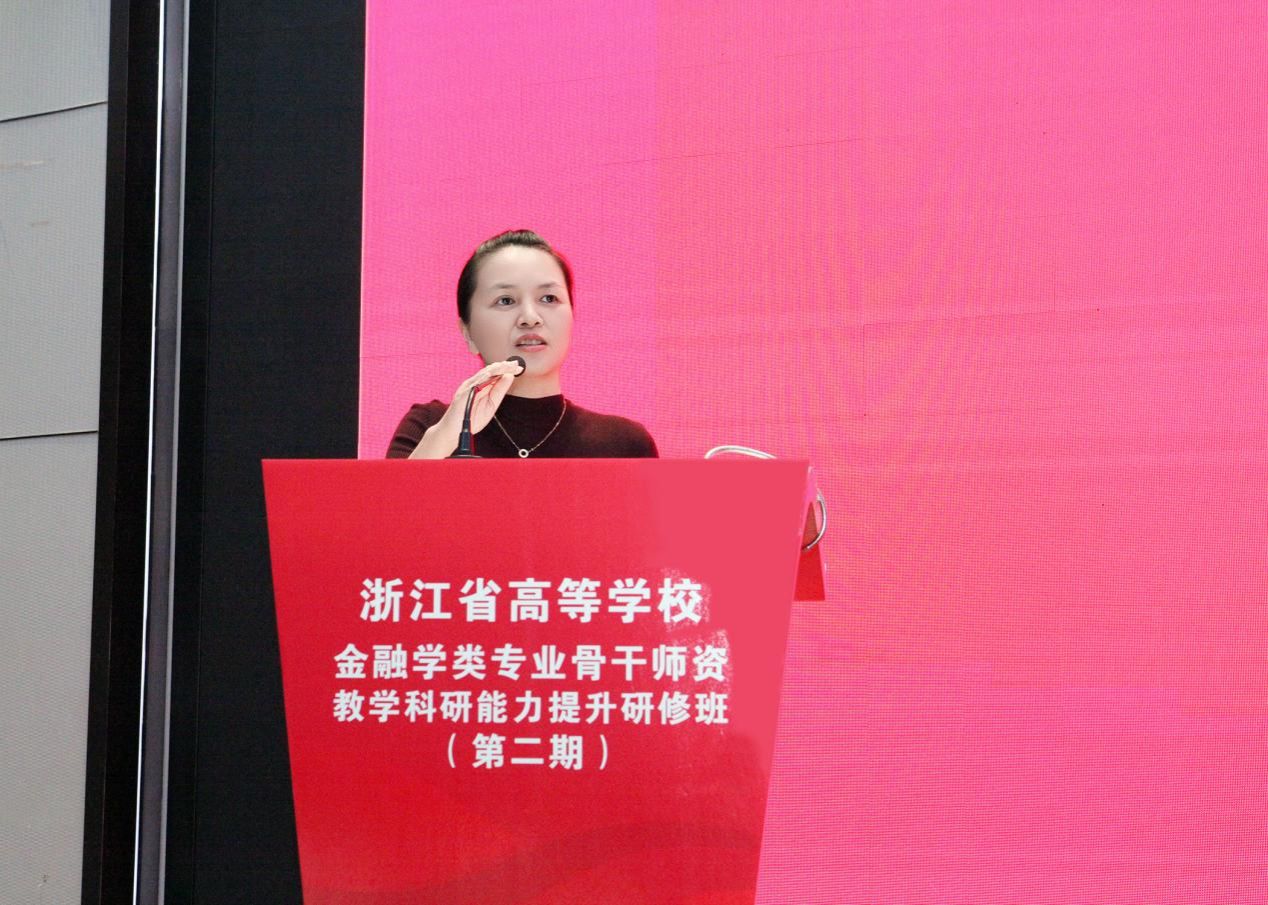 研修会第二阶段由宁波大学金融学专业负责人周新苗教授主持。北京财贸职业学院校长、教育部高等学校金融学类专业教学指导委员会(下面简称教育部金融教指委)委员杨宜教授作了题为《数字时代新商科人才培养的思考与实践》的报告。杨教授系统阐述了全球数字经济发展趋势及国家战略背景,指出新商科教育应以“新技术、新商业模式、新业态”为驱动,打破学科壁垒,强化数字思维与跨界融合能力。她提出以“新思维、新理论、新工具、新能力”为特征的人才培养路径,并分享了学校在“五金建设”——即金专业、金课程、金教师、金教材、金基地方面的创新实践,包括构建能力图谱、开发AI通识课程、建设虚拟仿真基地、推动产教深度融合等具体举措,为培养“精专业、懂AI、能实践”的复合型商科人才提供了系统解决方案。
