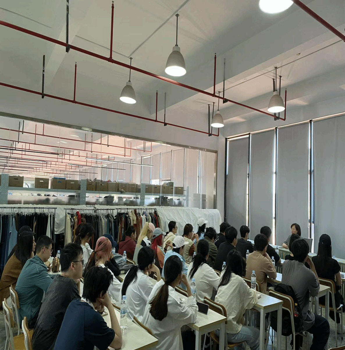 首先,宁波百纳服装公司蒋经理给学生们介绍了本次劳动实践的内容与安排,并带领学生亲身体验企业的各类服装产品,深入了解百纳服装公司的优势和特点。此次实践活动采用“理论 + 实操”双轨模式,让学生全方位感知服装产业链运作。在企业蒋经理的带领下,学生们首先走进产品展厅,通过触摸面料质感、观察工艺细节,直观感受企业的设计创新与品质把控。随后,蒋经理带领学生参观服装公司的生产流程,包括认识公司生产流水线、服装包装、标签粘贴、仓库整理等环节,并且蒋经理还为学生们介绍了服装企业生产中各类机器的功能,使参与学生对服装行业生产有了基本了解。最后,在实践环节中,学生们化身“临时员工”,分组参与服装分拣、质检包装等核心工序。在企业导师的指导下,他们严格执行国际订单质检标准,通过流水线分工协作,确保每件产品都符合出口品质要求。