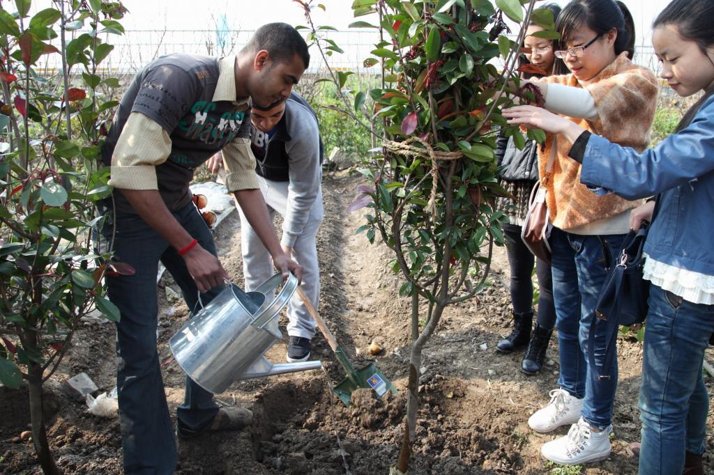3月12日早,在植树节来临之际,学工办老师带领我院留学生与本科生第四党支部在春潮渐起的甬江边开展了“我与绿色有个约会——中外合植友谊树”活动。 一大早,同学们就从学院出发。一路上,留学生与支部成员对于各自的学习、生活展开了热情的交流,路途也变得活跃生动起来。来到甬江边,同学们热情高涨,迫不及待的拿起铁锹挖树坑、植树苗,为小树浇水……同学们忙的不亦乐乎,虽然几个女同学由于力气不足等因素遇到了一些困难,这个时候大家才发现我们的外国留学生们已经又快又好地种下了属于自己的树苗,周围的学生都开始打趣称他们是“专业人士”也不为过。不过外国友人倒并不介意,反而很高兴地接受了赞美,并兴致勃勃地开始主动给周围的女生们提供帮助,埋头种树,此举更是换来了周围老师同学的善意笑声。此次植树节活动也取得了远超预料的成功。 |