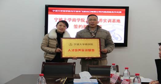 2013年12月27日下午3点,包玉书11号楼412会议室举行了电竞博彩-国内电竞博彩 和宁波华飞联合进出口有限公司共建人才培养实训基地的签约暨授牌仪式。出席仪式的有宁波华飞联合进出口有限公司总经理关泳华、外销主管曾江、华普分公司外销主管沈志圆、人事主管李子嫣、总经理秘书吴新军、人事专员蔡丽娟和电竞博彩 学工办主任董璐老师、学工办王凡老师、金耀老师。电竞博彩 社团联以及学研社二十多位学生代表到场见证了这一时刻。