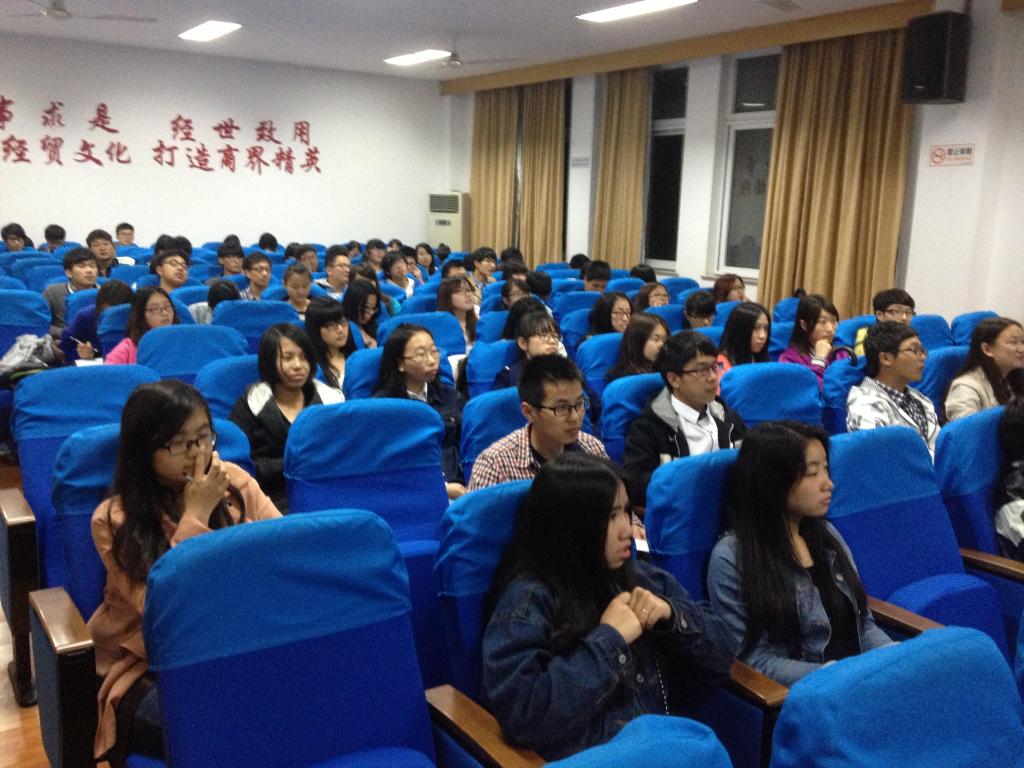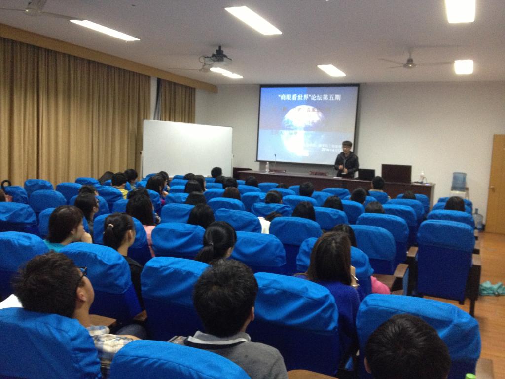 2014年4月13日晚6:30-8:30,“商眼看世界”论坛第5期在电竞博彩 414报告厅成功举行。本次论坛邀请到的主讲人是电竞博彩-国内电竞博彩 2010级学生,曾任宁波大学网络电视台副台长的田耿学长。一百多位来自电竞博彩 和科技学院的师生参加了本次论坛。