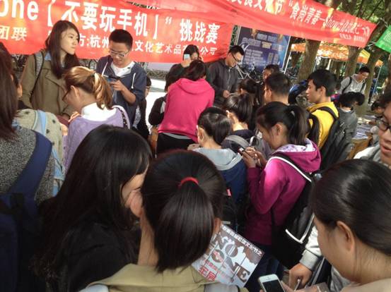 此次挑战赛的规则是由工作人员先为参赛者的手机设置密码,从而参赛者无法玩手机,并且最后累计大家不玩手机的时间,以此来评奖。同时参赛者需在微信朋友圈或QQ空间发一条声明,以示不玩手机的决心。活动一开始,商社联到位又独特的宣传就吸引了大批同学到摊位咨询并且报名参加,外国友人也被活动吸引纷纷而至。三天的“No Phone”摆摊现场一如火爆,好不热闹,同学们参与比赛的积极性高涨。同时商社联从号召大家少玩手机的初衷出发,取得了双赢的效果。