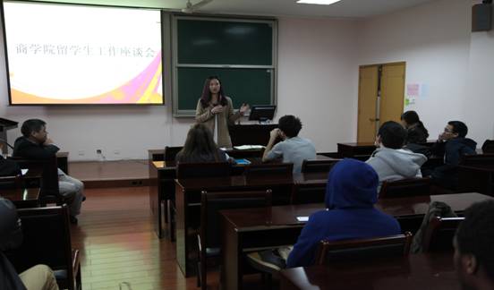 近日,电竞博彩 留学生工作座谈会顺利召开。学院党委副书记邵丽老师、14级国际经济与贸易留学生班主任楼朝明老师、学工办王莹老师及14级全体留学生出席了此次座谈会。