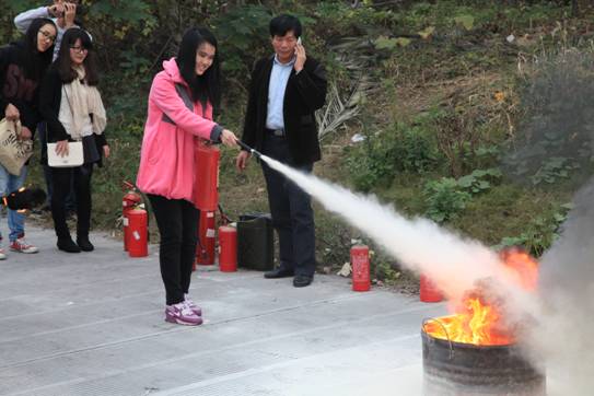 任何不以实践为基础的理论都是空中楼阁。故金济富老师在以理论的形式为大家讲解了灭火器的灭火原理及使用方法之后,带领大家来到一条偏僻的道路进行实践演练。