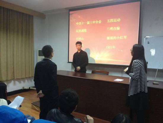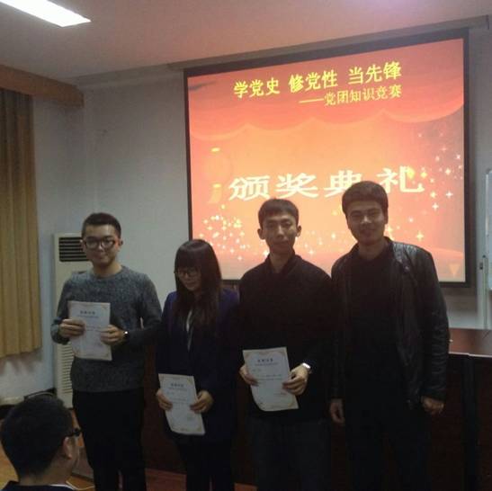 接下来,比赛正式开始。本次知识竞赛共分三关。第一关:狭路相逢。由选手随机挑选一位我党历史上或现实中人物,题库随机给出八个关键词,答题者要在三分钟内回答出这八个词,本关六进三。第二关:互动搭配。由晋级选手选择一位搭档,根据大屏幕上出现的与党有关的关键词一方描述,另一方做答,限时三分钟,答对多者晋级,本关三进二。第三关:谁与争锋。本关为抢答题,率先答对11个,且超对方2个的获的冠军。由于选手准备充分,搭档配合默契,整个比赛趣味横生,赢得了大家的一致喝彩。经过层层角逐,最终由国际商务党支部的华甜获得“冠军”,联合党支部的余璇获得“亚军”,金融学党支部的胡敏杰获得“季军”。