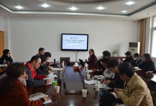 首先,杨蕙馨教授以中国经济高增长还能维持多久这一问题引入,阐述经济增长的两大来源即配置效率和生产效率,并指出中国30多年来的经济增长主要来自于配置效率。其次,杨教授从新常态下中国经济潜在增长率下降这一现象出发,深度剖析这一变化的四大原因:一是市场需求不足,中国经济30年以来的以工业为基础,以出口为导向的模式难以为继;二是以往价格低廉的农村劳动力供应不足,工资上升,制造业面临挑战;三是老龄化现象的出现使得投资驱动下的经济增长难以实现;四是资源环境条件日渐紧张。基于上述分析,杨教授认为未来的中国经济增长的主要源泉是生产效率的提高。最后,杨蕙馨教授通过分析沃尔玛再次成为世界五百强首位的原因,提出中国企业应整合成长,加强供给侧改革和创新驱动。报告结束后,杨教授就国家自然基金和社科基金申报与师生进行了积极的讨论,现场气氛活跃热烈。