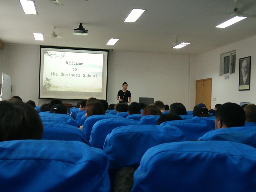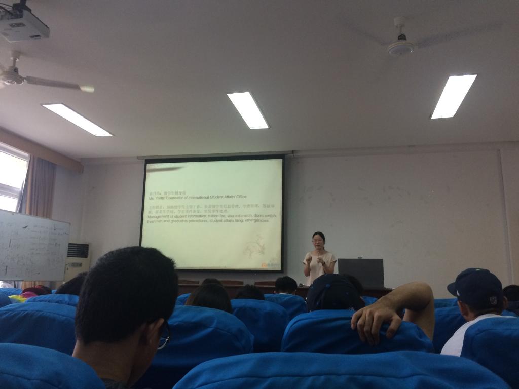 上午10点,新生们陆续到达了我院414教室。首先,毛老师向大家介绍了留学生办公室成员,并陈述了成员的职责和联系方式。接着,各班班主任进行了自我介绍并宣布了班会时间及地点。随后,王小西老师向新生们介绍了相关课程安排并且为新生们答疑解难。最后,老生代表Munawar发表了的精彩的演讲,向新生们深情并茂的讲述自己在中国的留学经验并给予新生一些学习和生活上的建议。会议结束之后,留学生组老师以及老生代表带领了新生进行了游园活动。