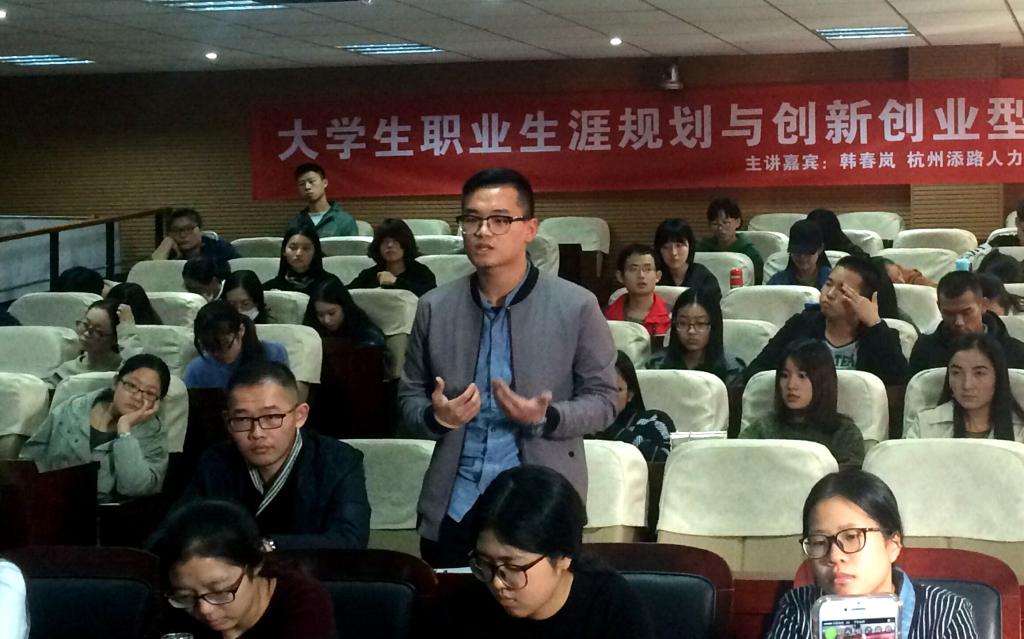 11月11日下午,杭州添路人力资源开发有限公司总经理、我院1986级工商经济系校友韩春岚女士受邀为我院2016年创新创业训练营作了题为《大学生职业生涯规划与创新创业型人才塑造》的专题讲座,本次活动也是2016年创新创业活动月的子活动之一。院党委副书记邵丽、学工办主任董璐、创新辅导员李珊珊、创业辅导员葛振林以及创新创业训练营全体学员出席活动。